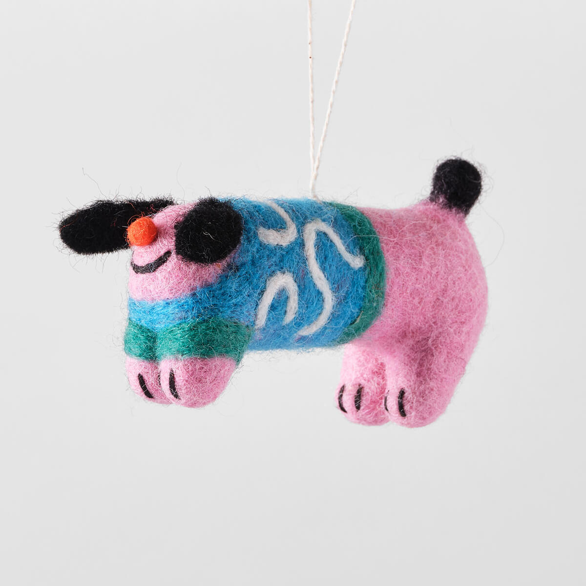Stumpy Dog With Abstract Jumper Felt Decoration by Wrap. Hand needle felted hanging Christmas tree decoration. Stumpy dog wearing his blue woolly jumper.