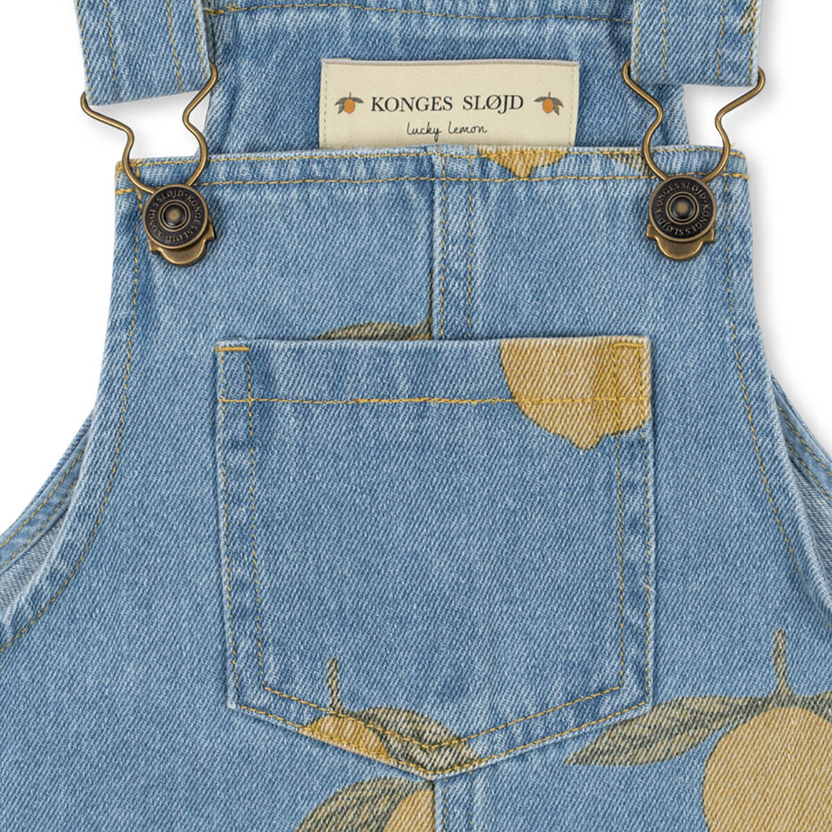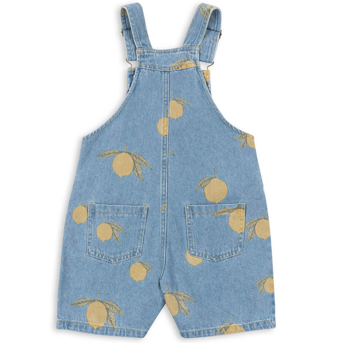 Magot Overalls by Konges Slojd. Short denim dungarees with signature logo fastenings and an all over lemon print.