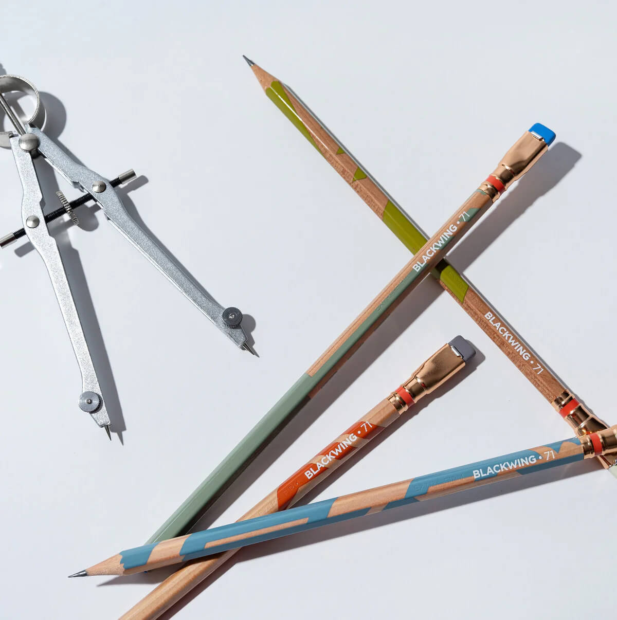 Blackwing Volume 71 - The Frank Lloyd Wright Collection by Blackwing. The Blackwing 71 is a limited edition tribute to Frank Lloyd Wright and his architectural ambition. Each pencil features a silhouette of one of Wright’s iconic perforated boards printed in a muted, midcentury palette. The area around the board is unfilled, letting the natural wood of the pencil shine through. Each pencil also includes a copper ferrule and extra-firm graphite.