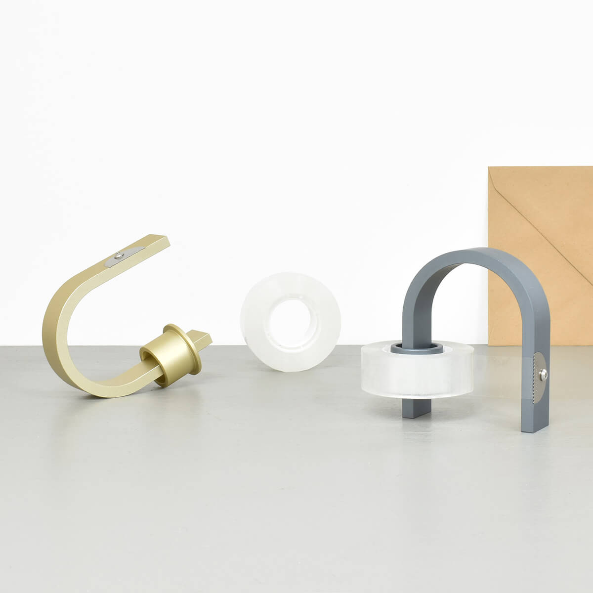 Hoop Tape Dispenser by Andhand. The all metal construction Hoop tape dispenser takes a simple unassuming form that brings elegance to any desktop space whilst also being an extremely durable and high performing piece of kit. The combination of precision machined aluminium and custom made stainless steel blade ensure a clean cut through the tape.