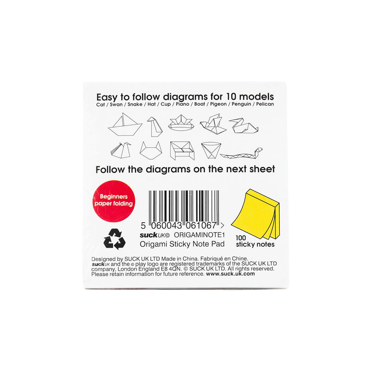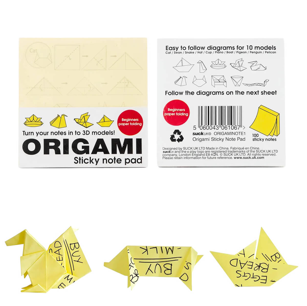 Origami sticky notes by Suck UK. Transform your notes into 3D models. Paper sticky notes with printed origami instructions, includes instructions for ten different shapes. An assorted pack for beginners or advanced origami artists. A little something to keep you occupied on a slow day at the office. Recycle your old reminders and notes into fun 3D models. With each pad including instructions to 10 different shapes, you can create animals, boats or even flowers. A great way to entertain yourself at the office!