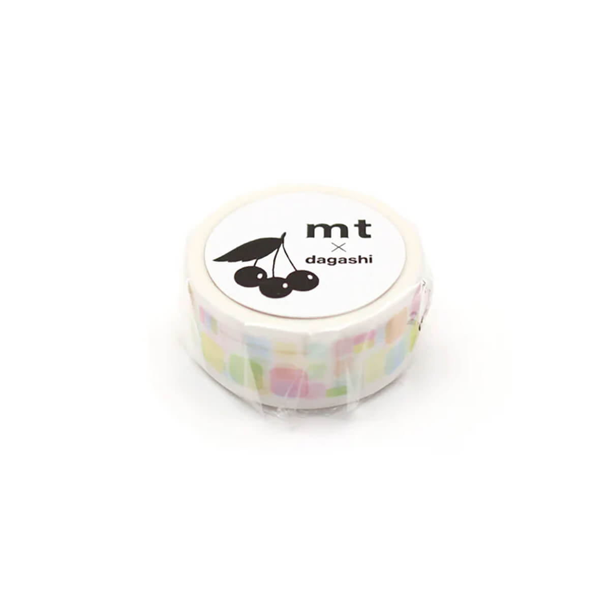 Sakuranbo Mochi Pattern 15mm Special Dagashi washi tape by MT Japan. Graphic and brightly coloured tape featuring an abstract pattern inspired by the popular fruit flavoured gummy mochi. From a special series of washi tape inspired by popular and iconic dagashi Japanese snacks, sodas and candies.