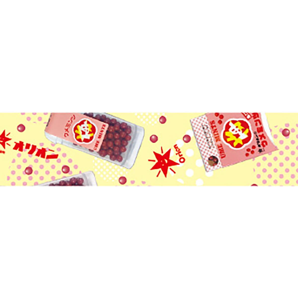 Ume Mints 15mm Special Dagashi washi tape by MT Japan. Graphic and brightly coloured tape featuring the popular Japanese plum flavoured mint sweets. From a special series of washi tape inspired by popular and iconic dagashi Japanese snacks, sodas and candies.