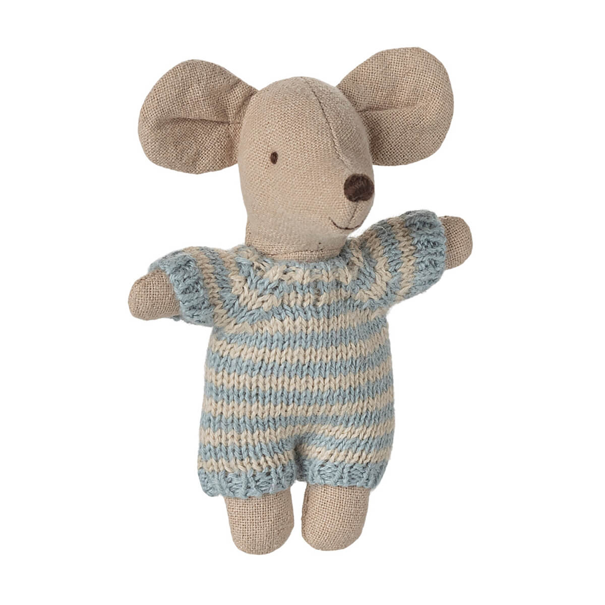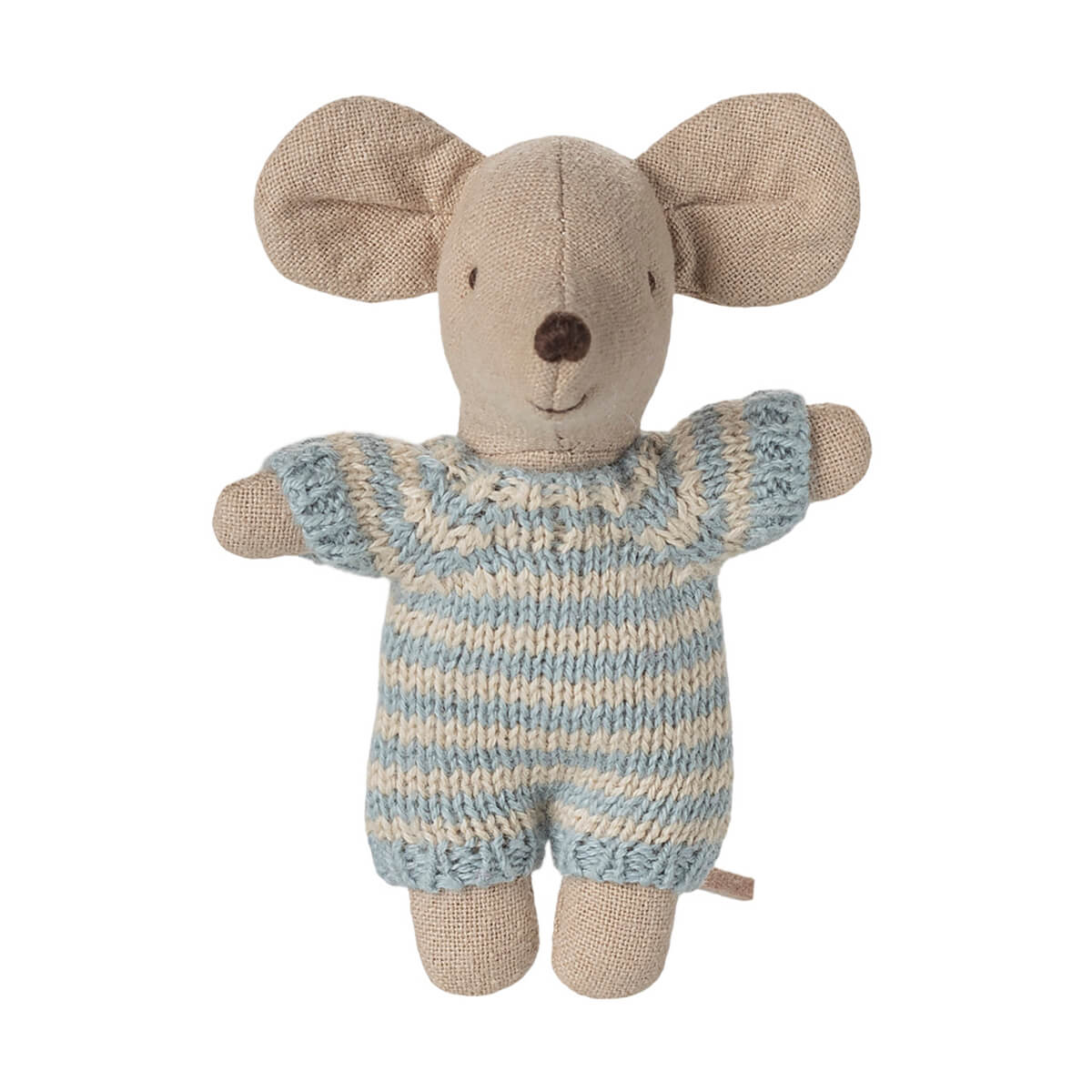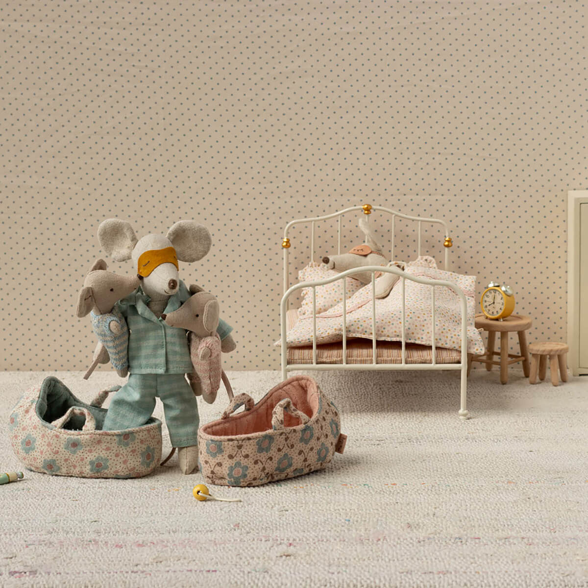 Baby Mouse in Carry Cot by Maileg. A small baby mouse in a soft and striped knitted suit. It sleeps for hours in its little quilted carry cot.