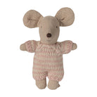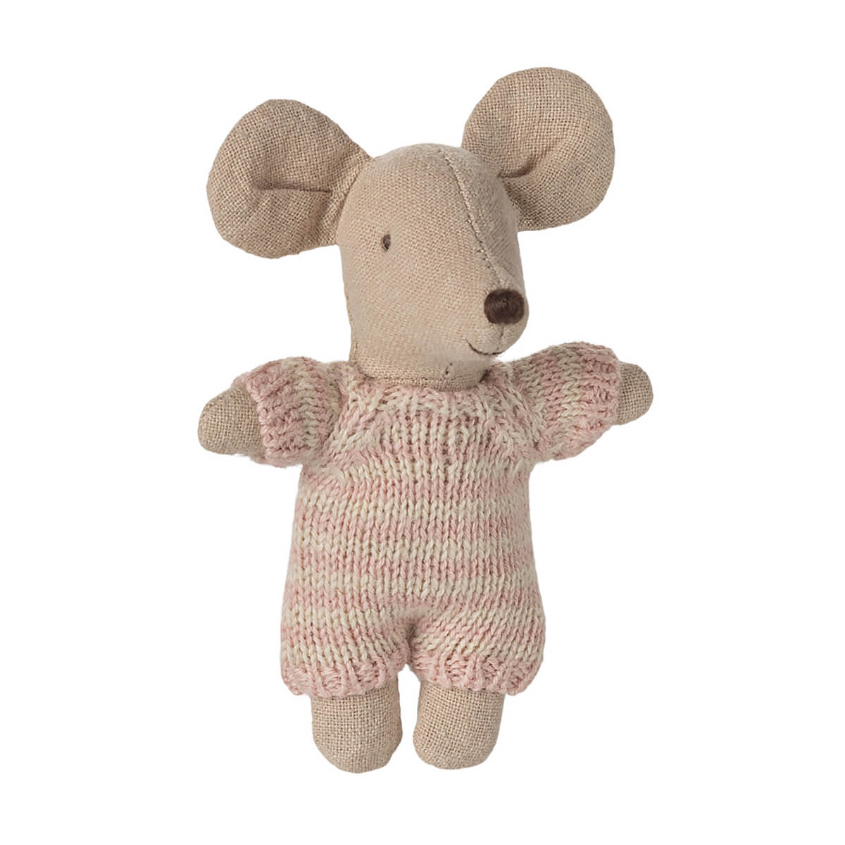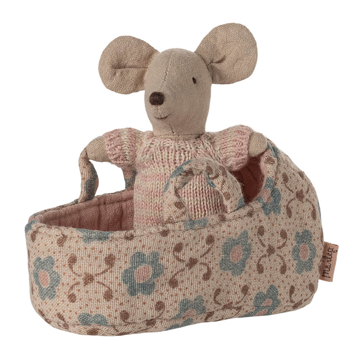 Baby Mouse in Carry Cot by Maileg. A small baby mouse in a soft and striped knitted suit. It sleeps for hours in its little quilted carry cot.