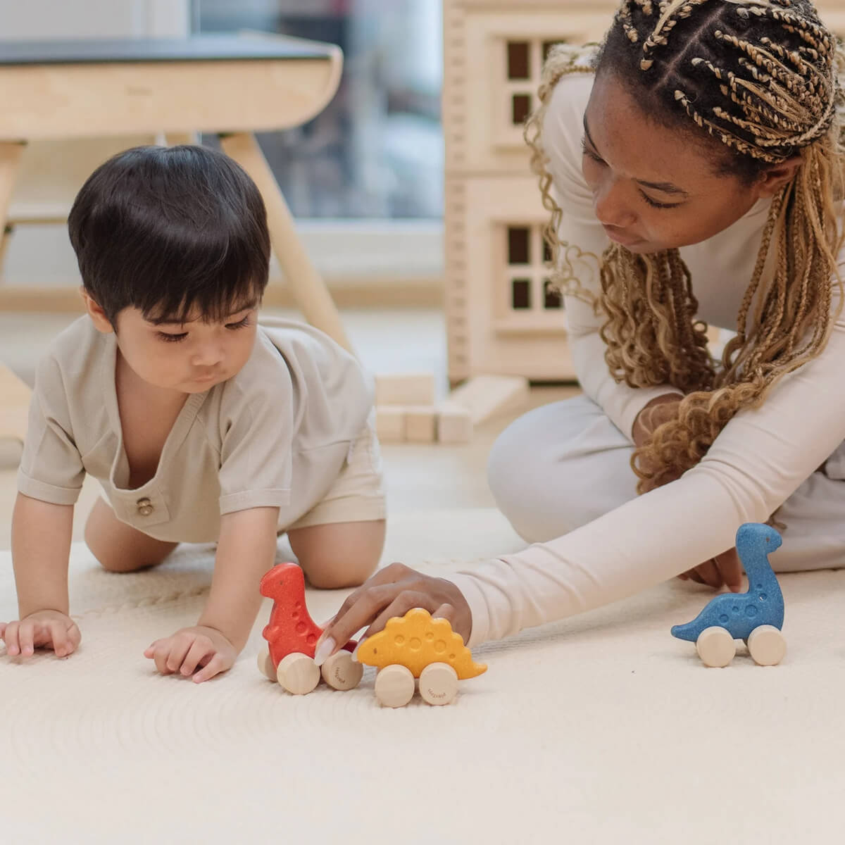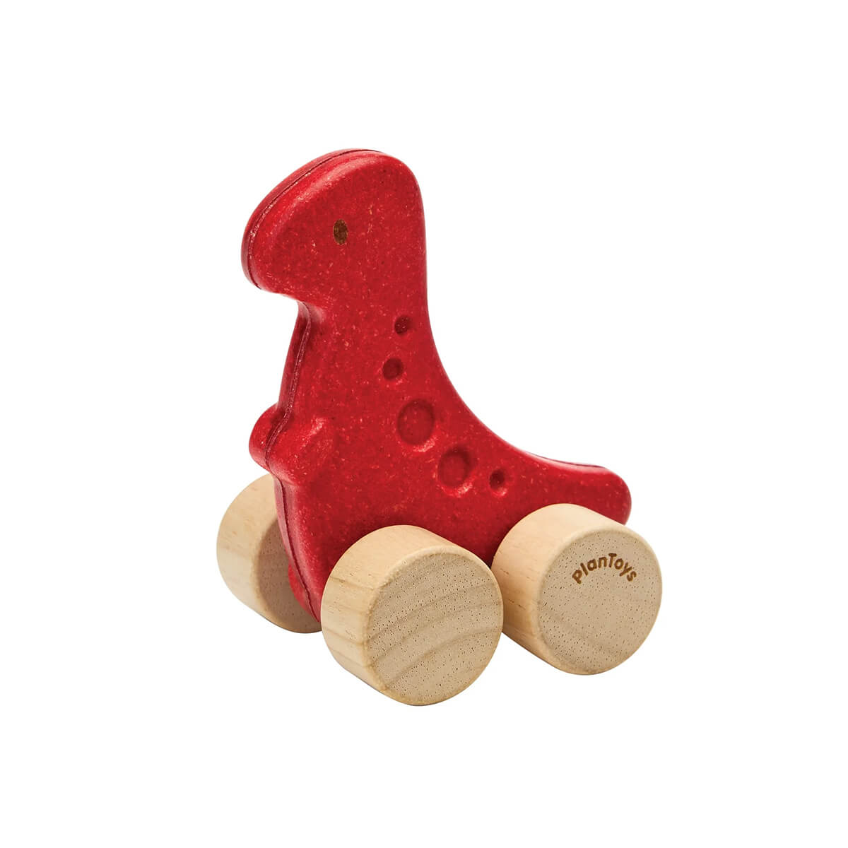 Dino car by PlanToys. These cute dinosaur baby cars fit into little hands perfectly. Your baby will enjoy rolling it around and watching them move up and down when pushed.