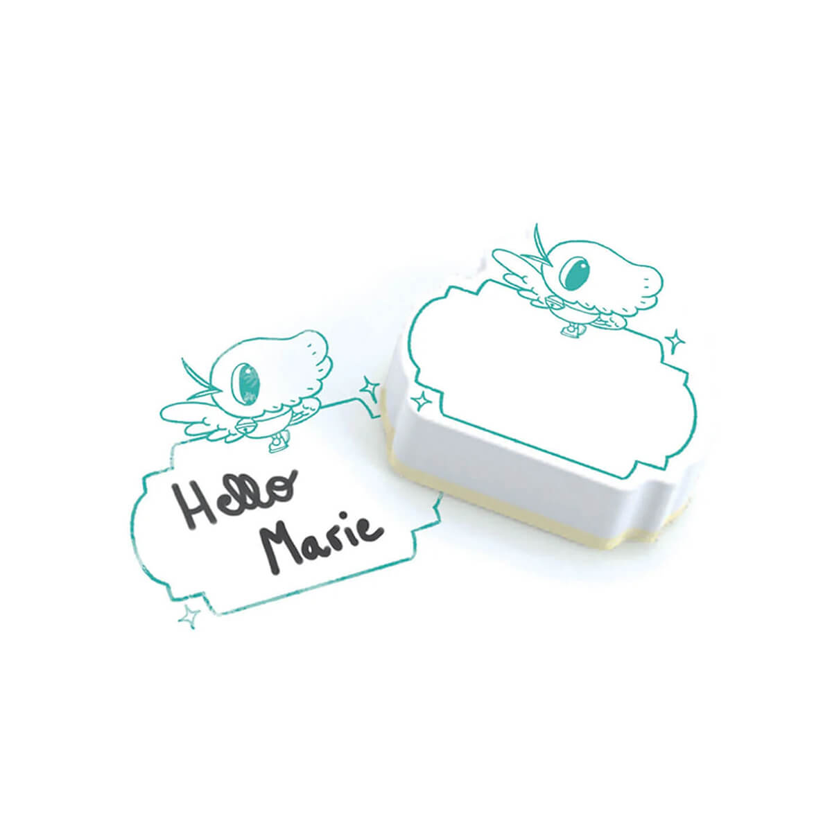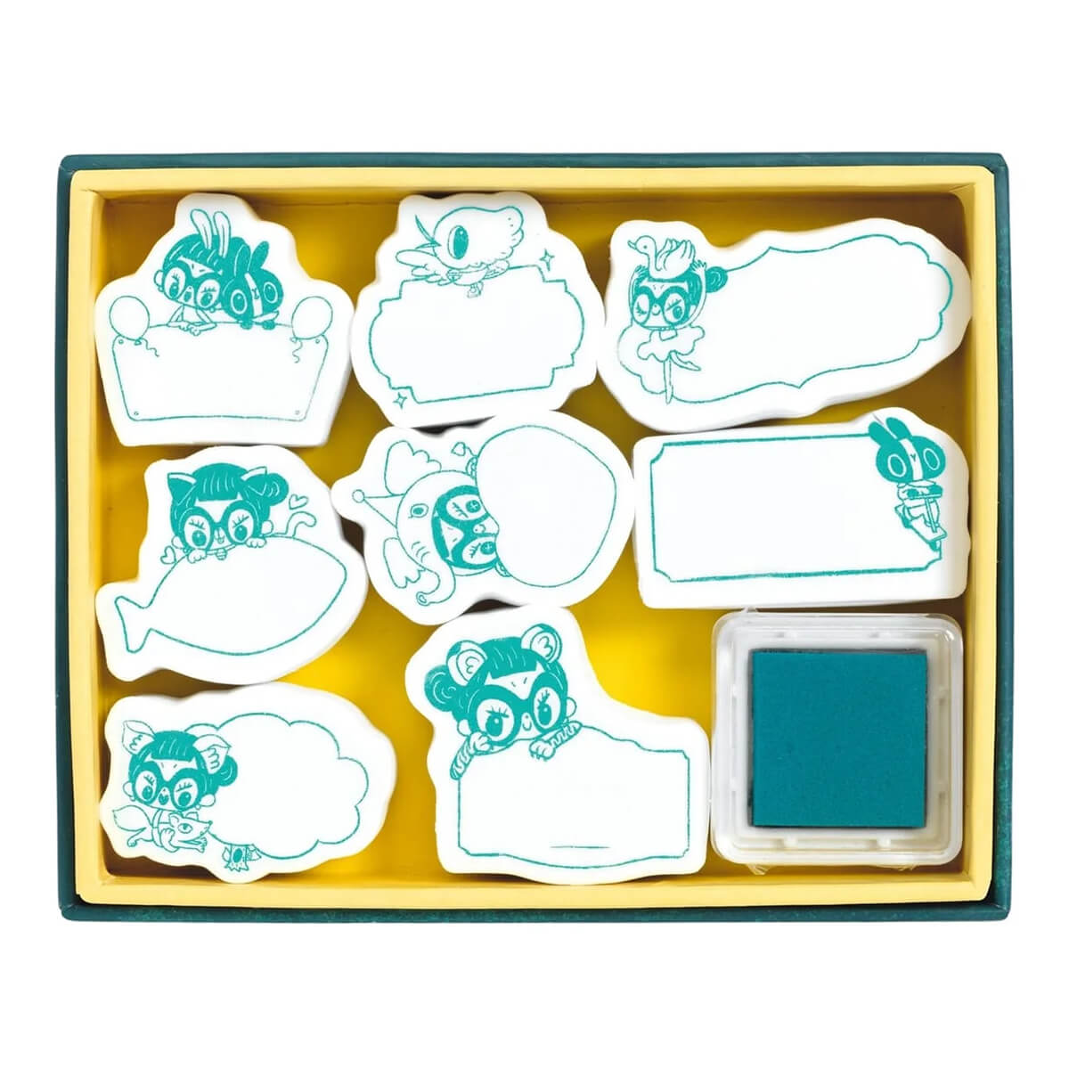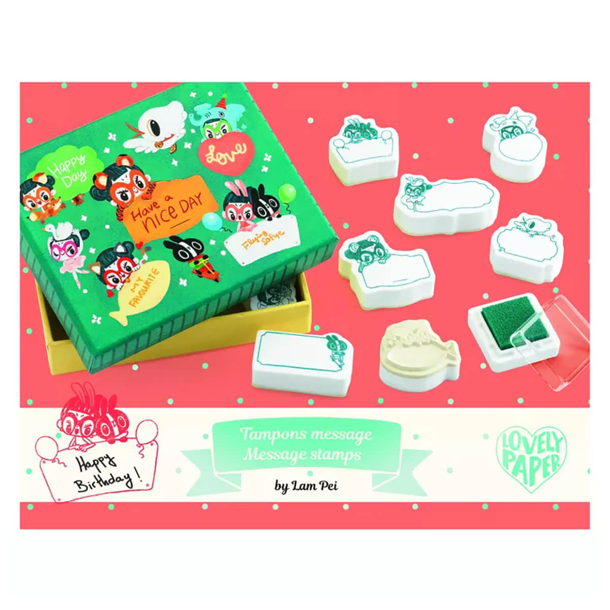 Lam Stamp Set by Djeco. A small, illustrated box containing an ink pad and eight “message” stamps. Once you have stamped the material, simply write a personalised message in the empty area.