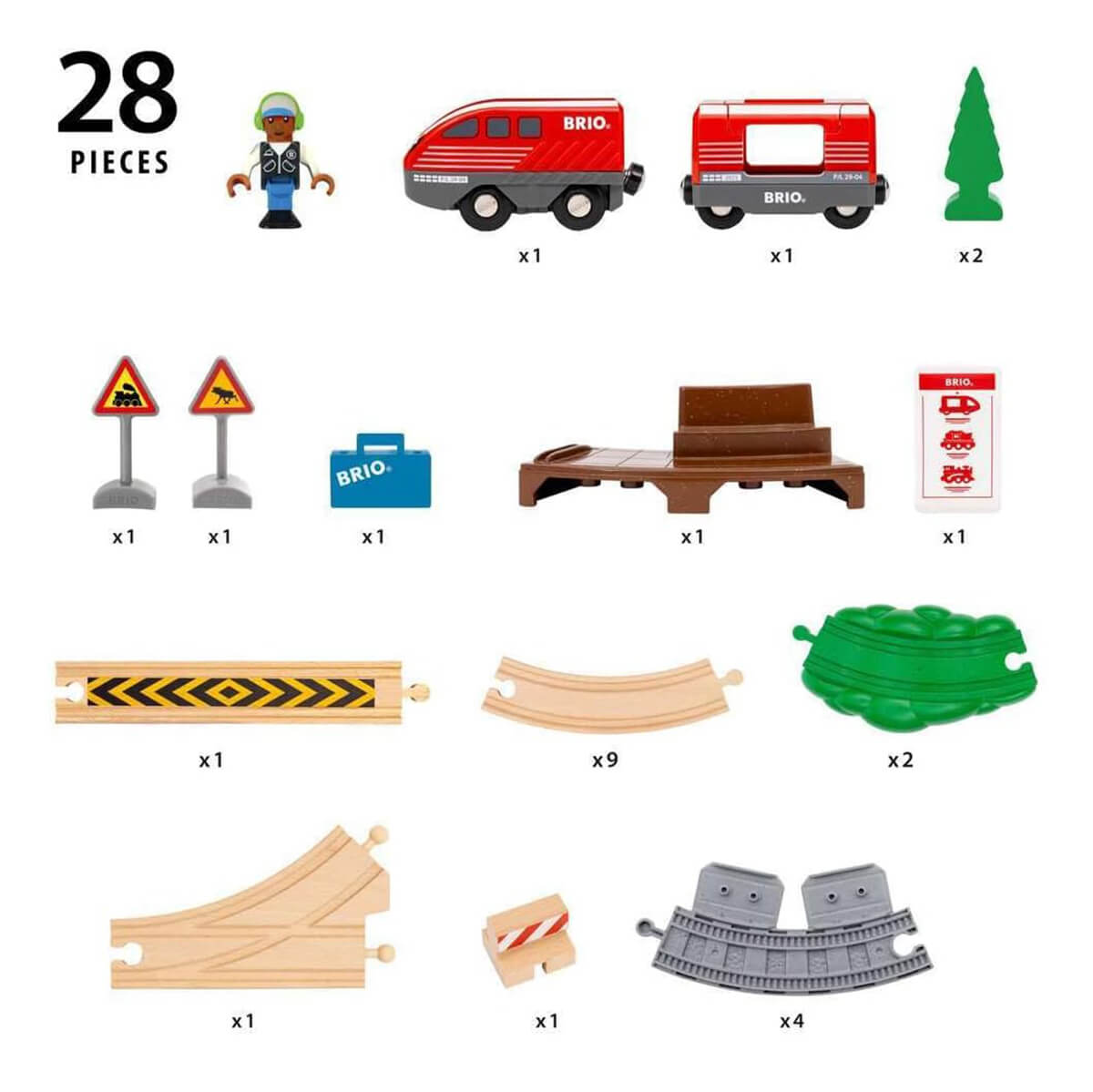 Pull Back Train Set includes 28 pieces: 1x Pull Back Train, 1x Travel Passenger Wagon, 1x Travel Figure, 1x Station Platform, 4x Station Platform Tracks, 2x Wooden Trees, 2x Scenic Tracks, 12x Wooden Track Pieces and multiple accessories.