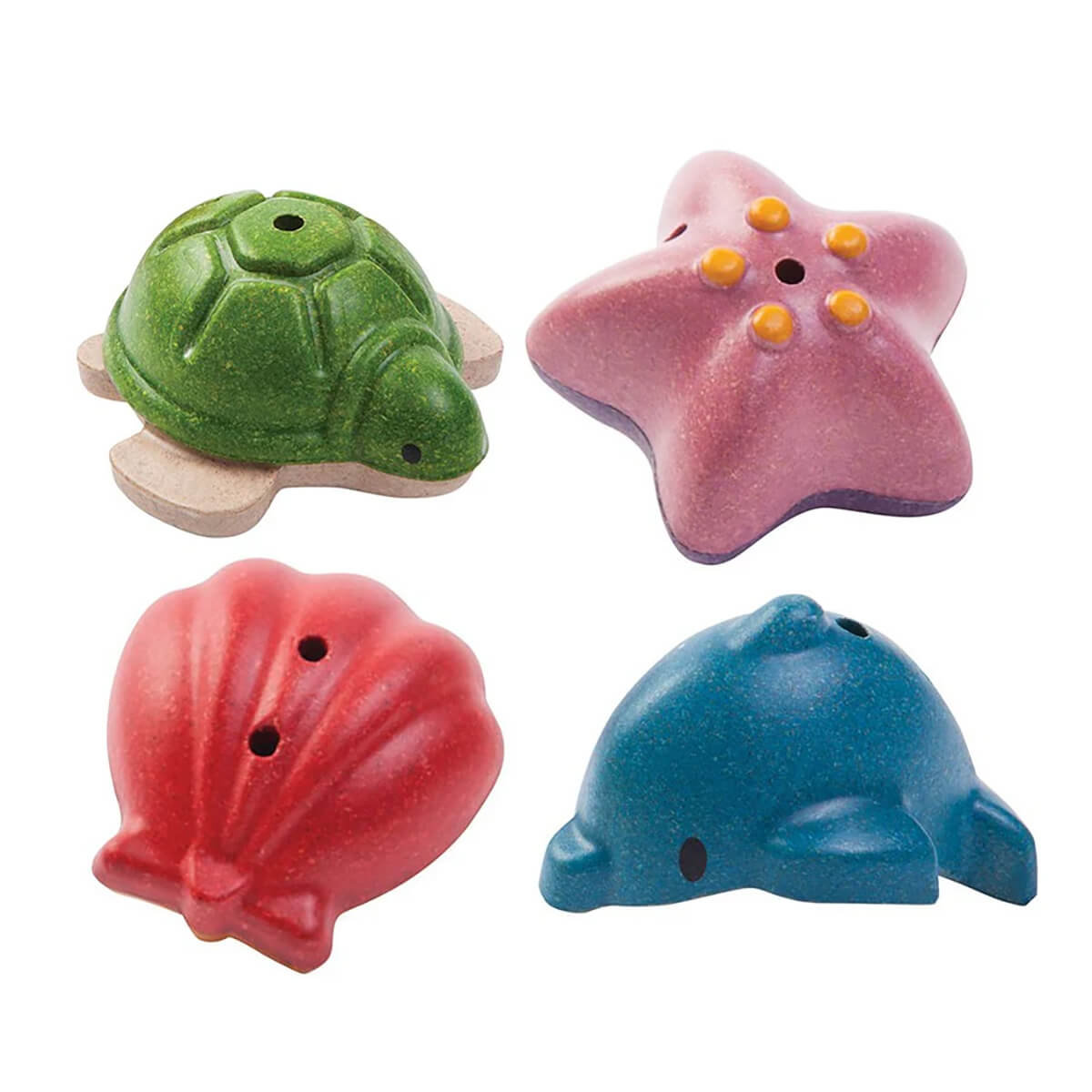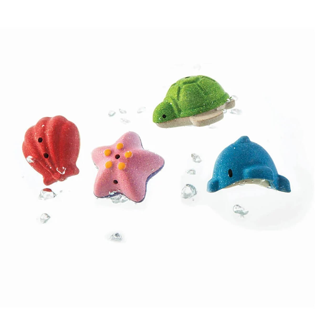 Sea Life Bath Set by PlanToys. Splash and make waves in the bath with this set. The fun never ends! Float them on the water, or submerge them in water and watch the bubbles rise. Set of 4 animals: Shell, Starfish, Turtle, and Dolphin.