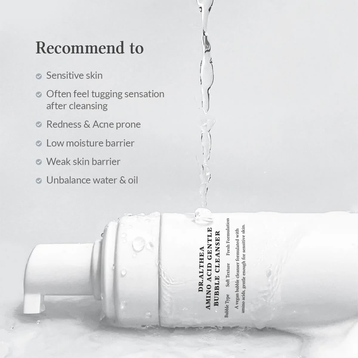 Amino Acid Gentle Bubble Cleanser by Dr. Althea. A soft, airy bubble cleanser formulated with amino acid–based surfactants to gently remove impurities, excess oil, and light makeup without disrupting the skin barrier. Its soothing, hydrating formula leaves the skin fresh, balanced, and comfortable after every wash. With a special Amino Acid complex, this formula nourishes, locks in moisture, and helps protect against signs of aging for healthier-looking skin.