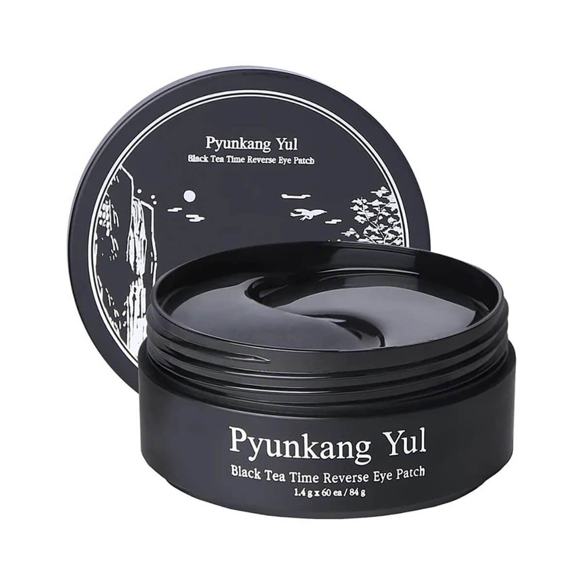 Black Tea Time Reverse Eye Patches by Pyunkang Yul. A jar of 60 single-use luxurious hydrogel patches designed to brighten, firm, and deeply moisturise the delicate under-eye area. Infused with fermented black tea (kombucha) extract, rich in antioxidants, they help improve skin elasticity and combat early signs of aging. Peptides and collagen enhance firmness, while soothing botanical ingredients soothe puffiness and replenish hydration. The cooling hydrogel texture adheres comfortably to the skin, delivering quick, refreshing results for tired or stressed eyes.