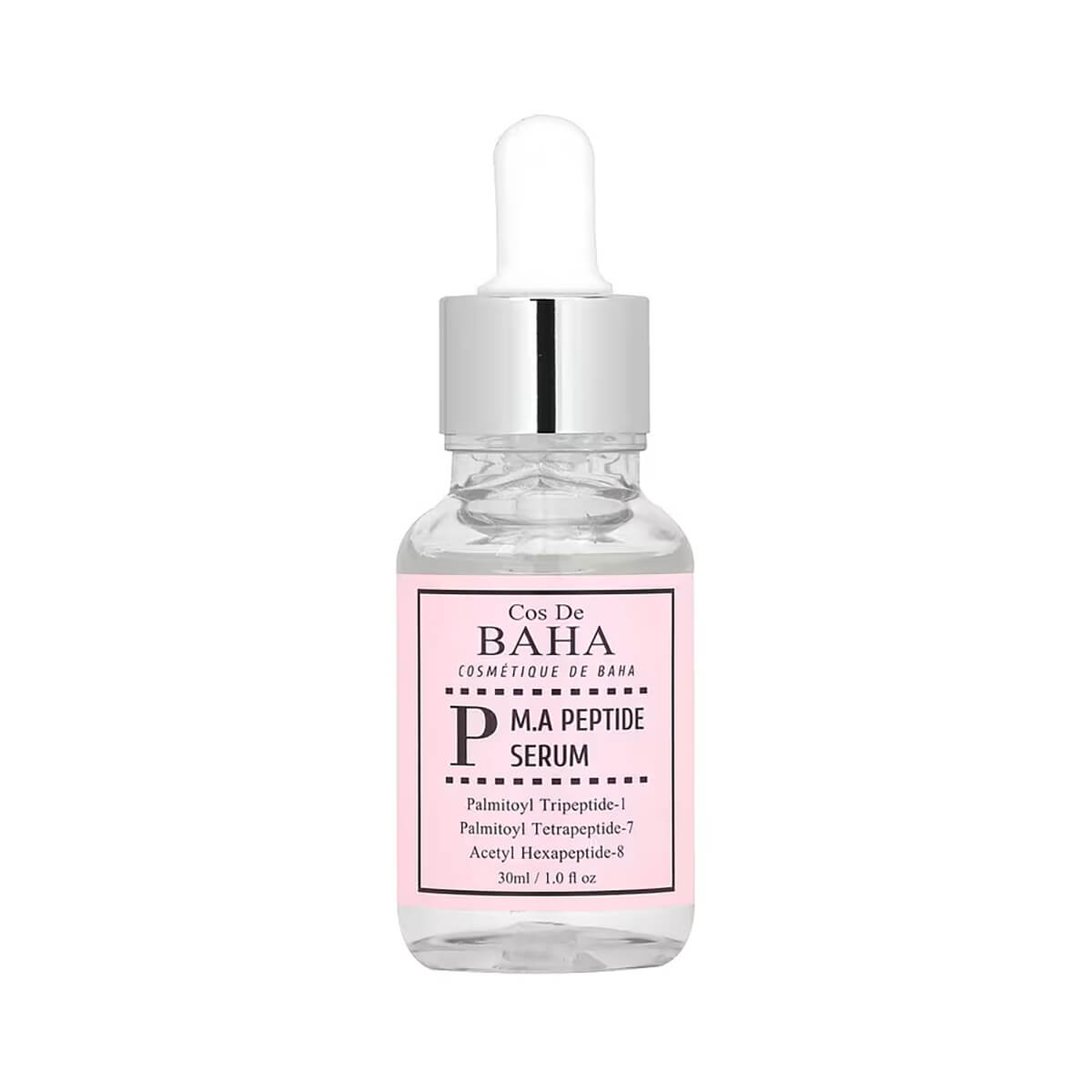 P M.A Peptide Serum by Cos De BAHA. A firming, rejuvenating serum formulated with a blend of peptides to boost elasticity, smooth fine lines, and enhance overall skin vitality. Its lightweight, silky texture absorbs quickly, delivering anti-aging and strengthening benefits for a plumper, more youthful-looking complexion.