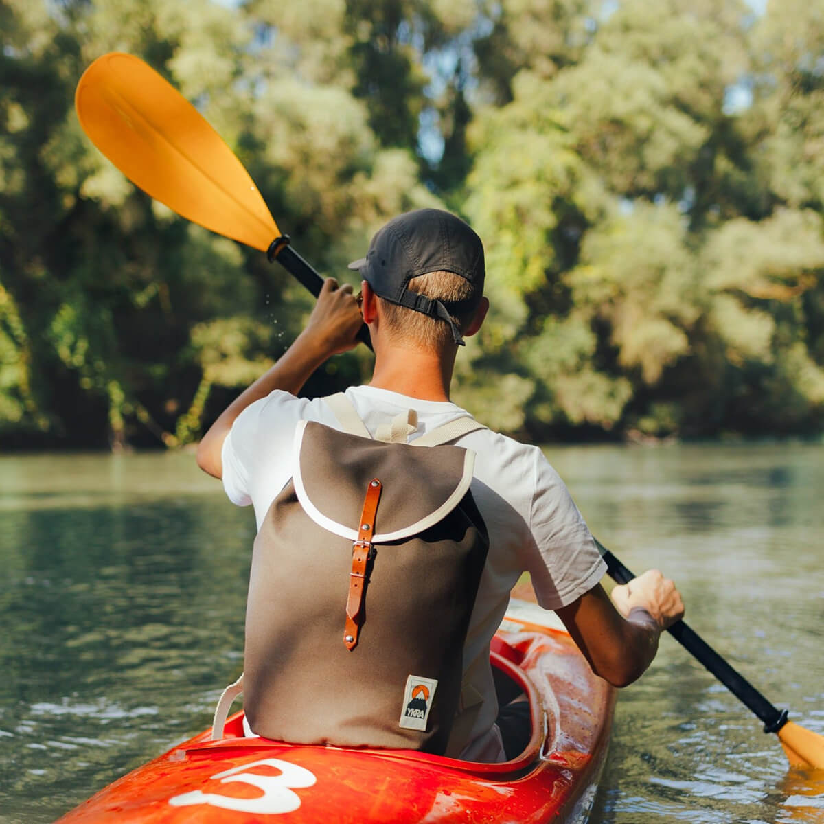 Sailor Pack backpack by YKRA. Simple cotton canvas daily carry backpack for everyday use, inspired by classic backpacks used for day sailing. The backpack features an inner laptop compartment that fits a 13″ Ultrabook or MacBook Air and a zippered pocket in the top flap. You can close the backpack with an adjustable sailing rope and a leather strap with metal buckles.
