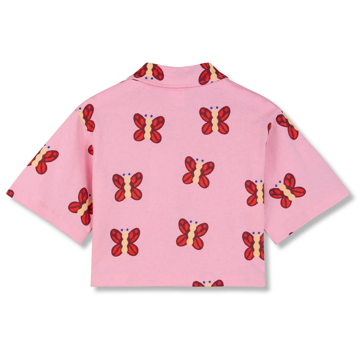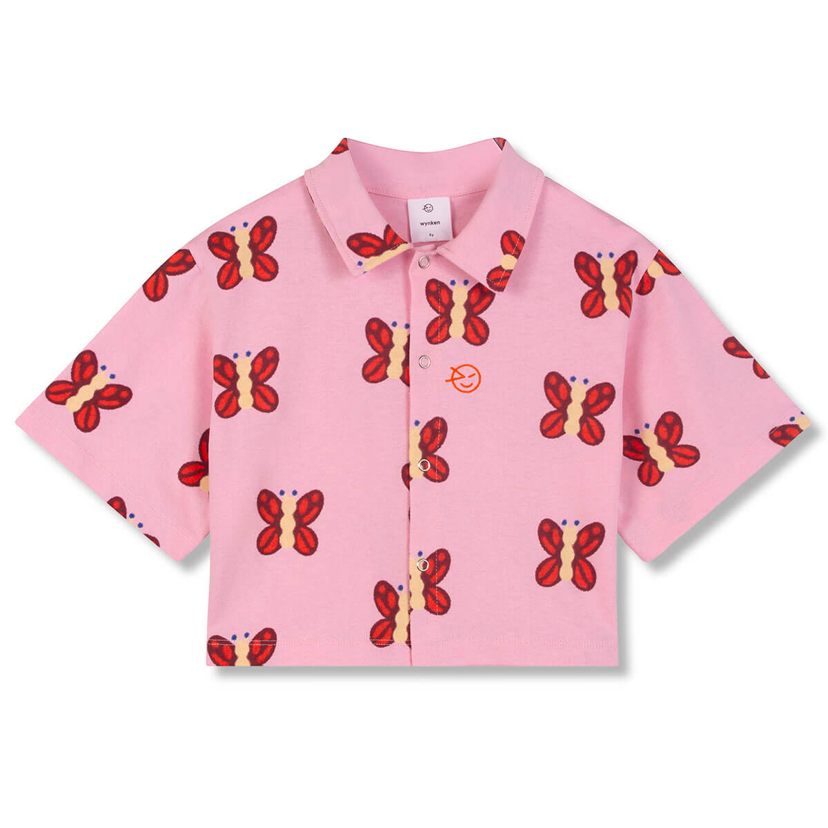 Beach Crop Shirt by Wynken. This beach cropped Shirt brings a playful, sunny touch with its candy pink base and all over butterfly print that looks like they’re flitting and fluttering through summer adventures. Made from 100% organic cotton, it feels soft, light, and comfortable on warm days. The neat collar adds a little structure while keeping the shirt easy to wear, and the front popper placket makes dressing and layering simple and fuss-free.