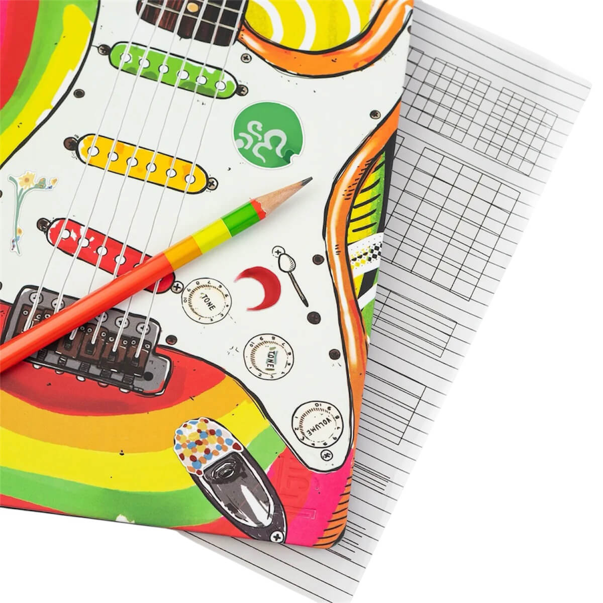 A5 format (approx.) for easy portability Design – Psychedelic “Rocky” guitar illustration inspired by George Harrison’s Stratocaster.