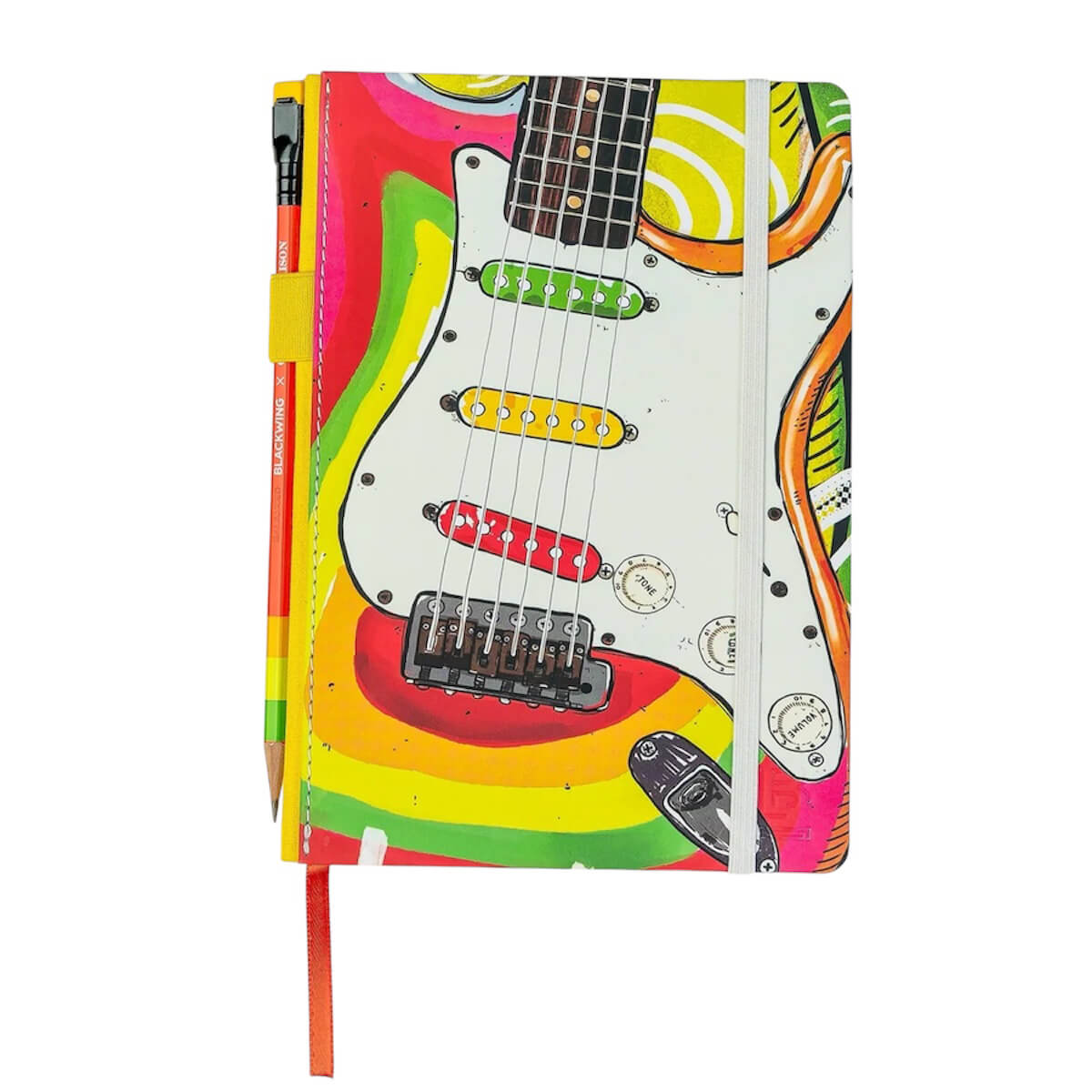 Blackwing x George Harrison Limited Edition A5 Notebook and Pencil by Blackwing. Created in honour of George Harrison’s 82nd birthday, this special edition songwriter’s notebook celebrates his iconic “Rocky” guitar and creative process. The notebook features a vibrant cover inspired by Harrison’s hand-painted Fender Stratocaster, designed in collaboration with the Harrison family. Inside, 160 blank pages of smooth 80 GSM paper provide ample space for lyrics, sketches or notes. A reusable insert offers manuscript paper, chord charts, tablature and ruled lines, while printed excerpts from George’s own songwriting notes offer a glimpse into his creative world. It also includes a sticker sheet with artwork from the original guitar and a matching Blackwing x George Harrison pencil in a bold, striped design.