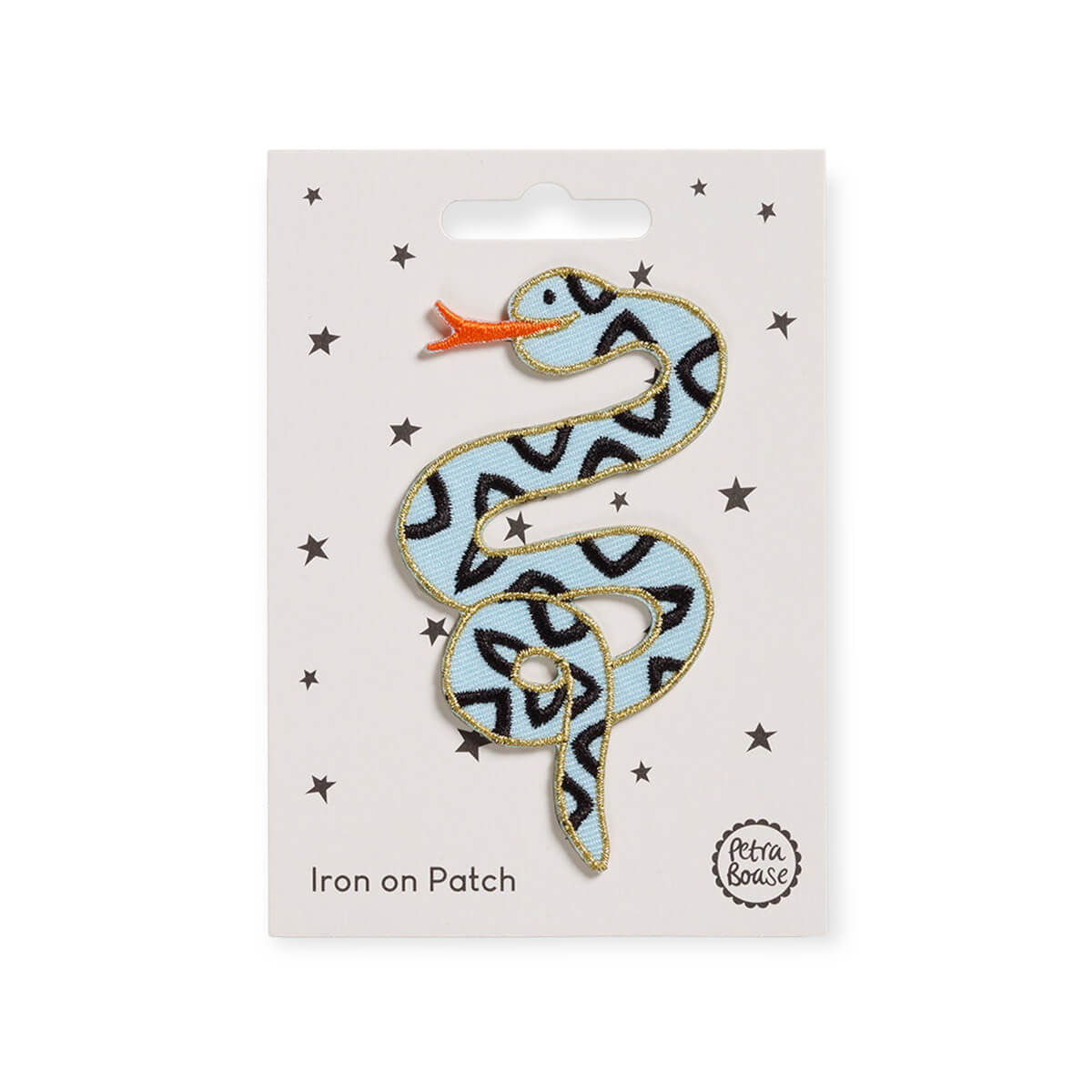 Blue Snake iron on patch by Petra Boase. Richly embroidered colourful patch, with an iron-on backing so can be removed from the card and ironed on to a favourite t-shirt, rucksack or whatever you like! The patch is a pale blue, with back and gold embroidered detailing.