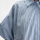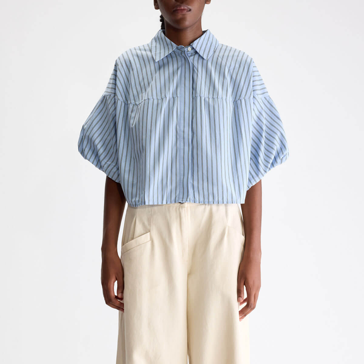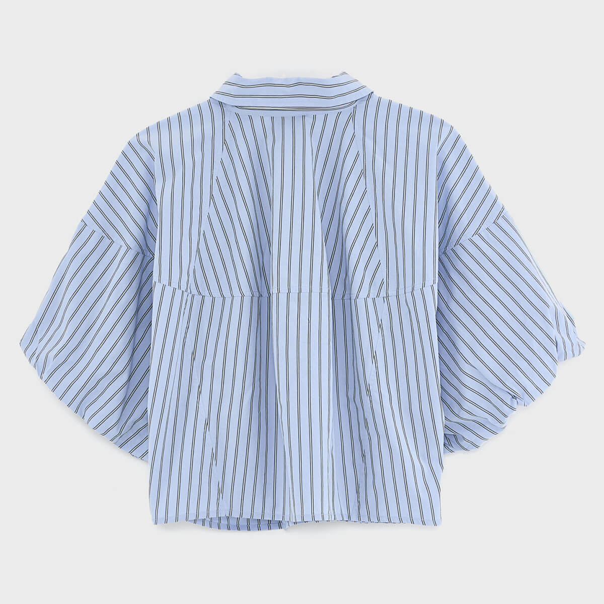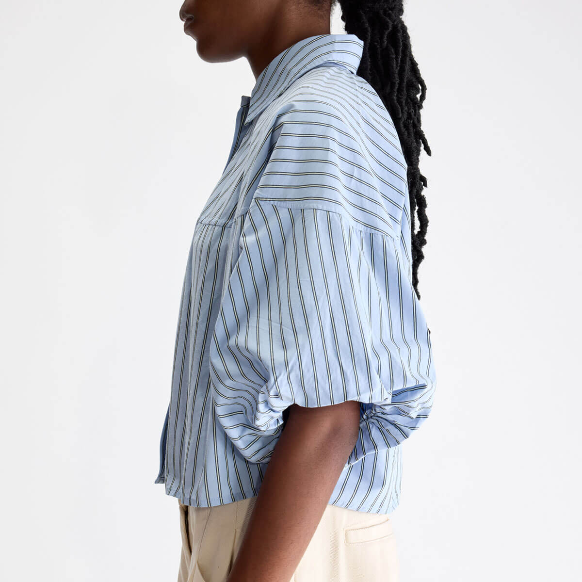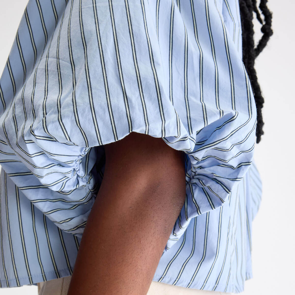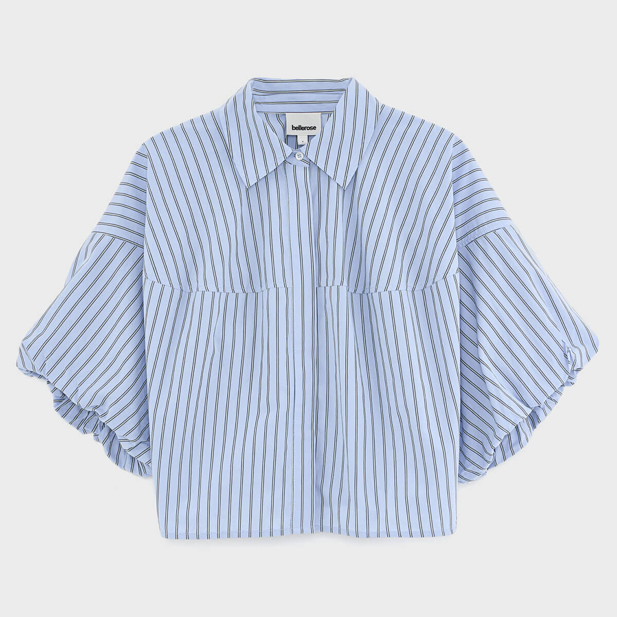 Cassy Shirt by Bellerose. Blue striped button-up shirt with puffy balloon sleeves.