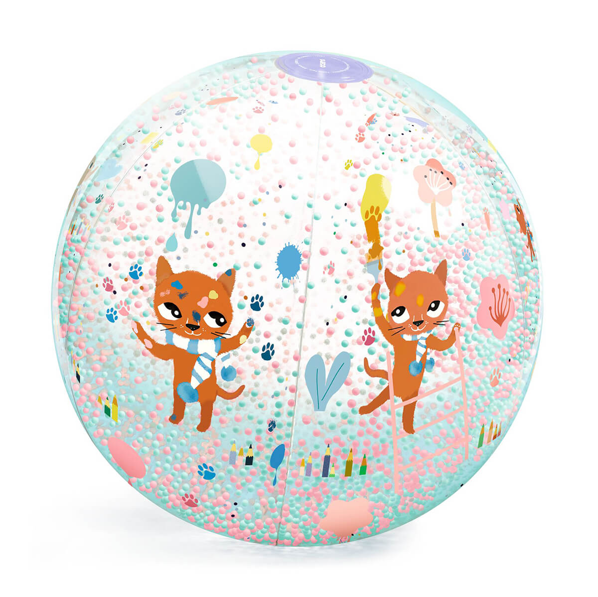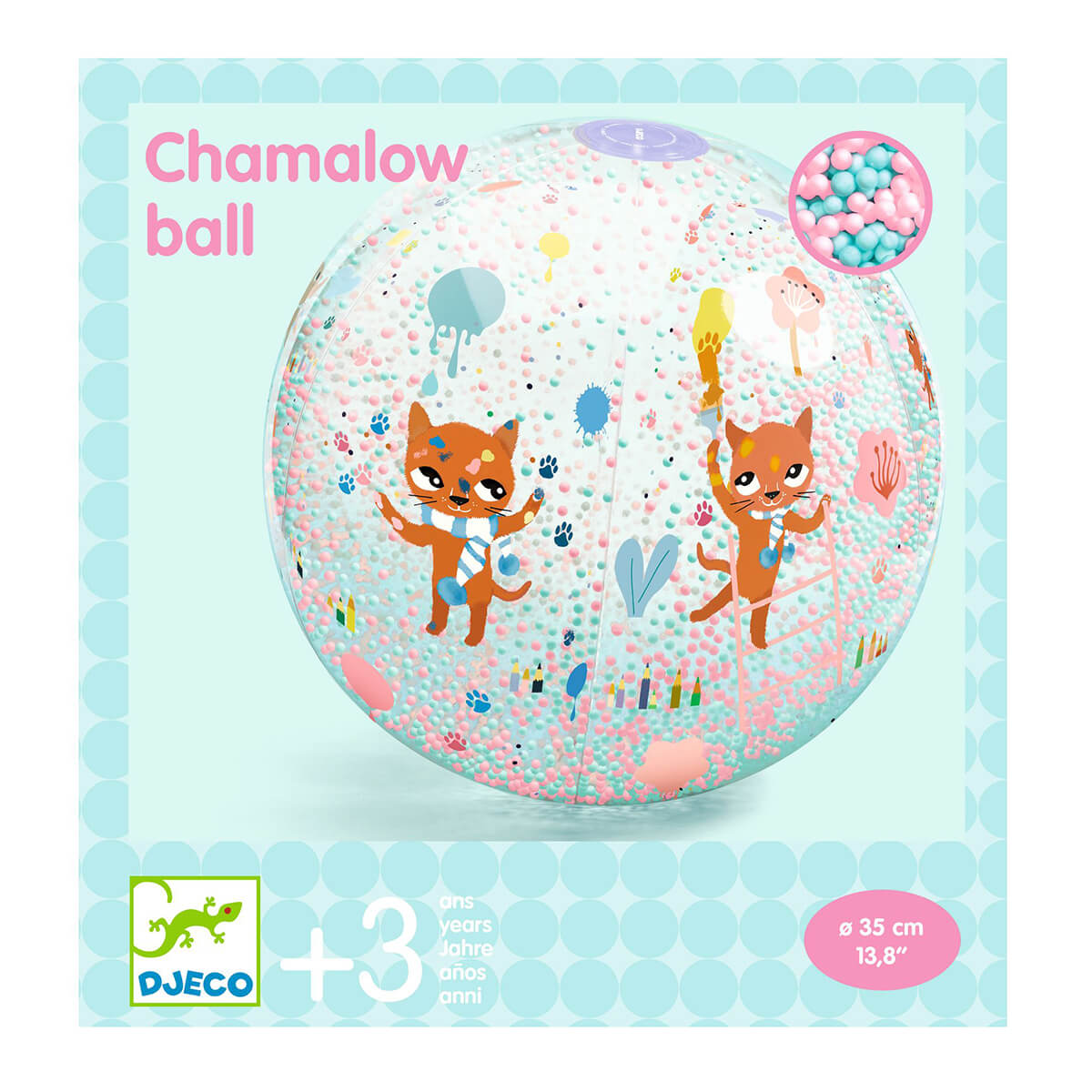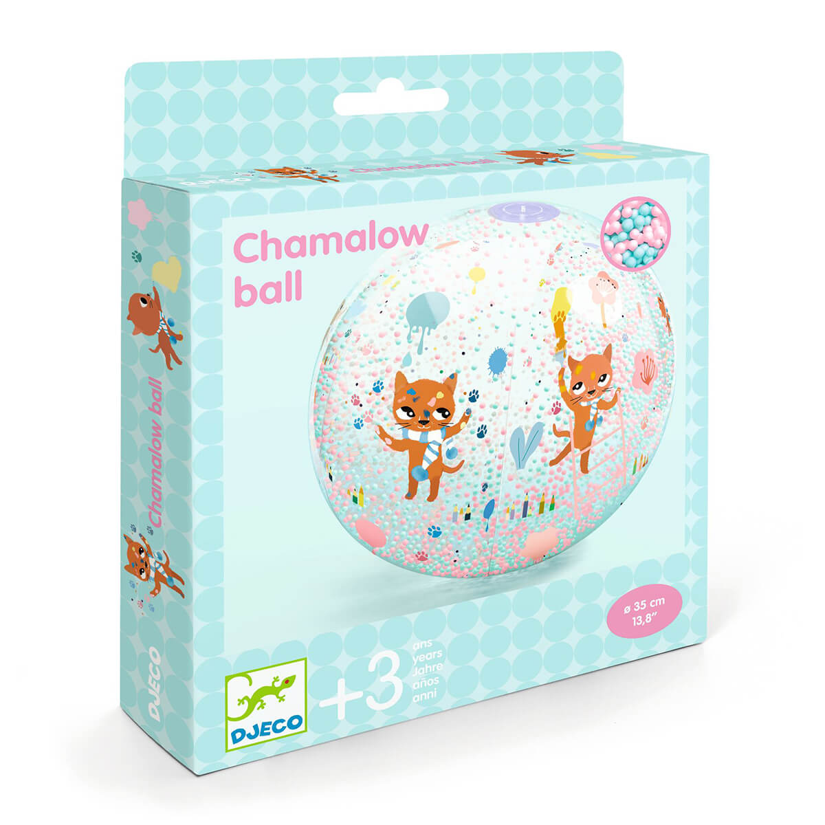 Chamalow Ball by Djeco. The Chamalow Ball is a lightweight, easily portable inflatable ball measuring 35cm in diameter, featuring an adorable kitten design. Its filling makes it the perfect companion for children, who are captivated by the movement of the colorful beads. Ideal for both indoor and outdoor use.
