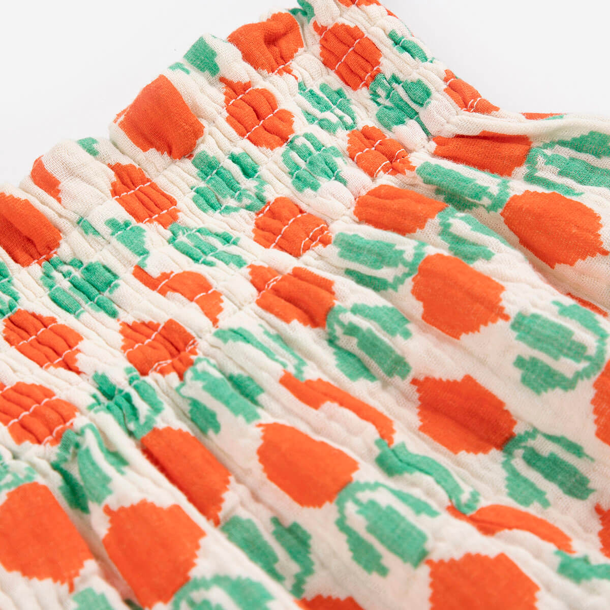 Cool Radish All Over Woven Baby Pants by Bobo Choses. White trousers featuring an elasticated waistband with adjustable drawstring, baggy fit, smocking stitching, ankle length, structured fabric and ruffled detailing.