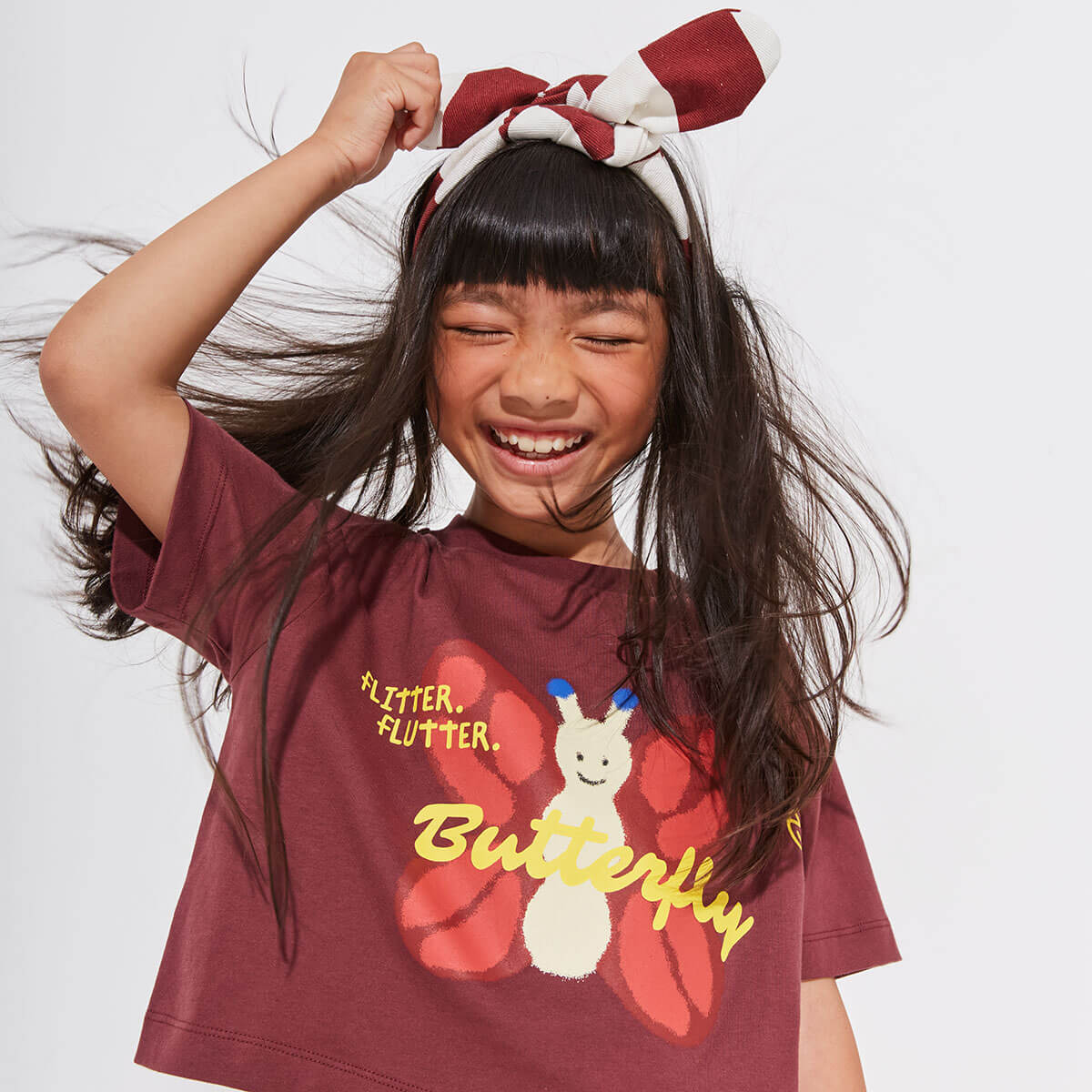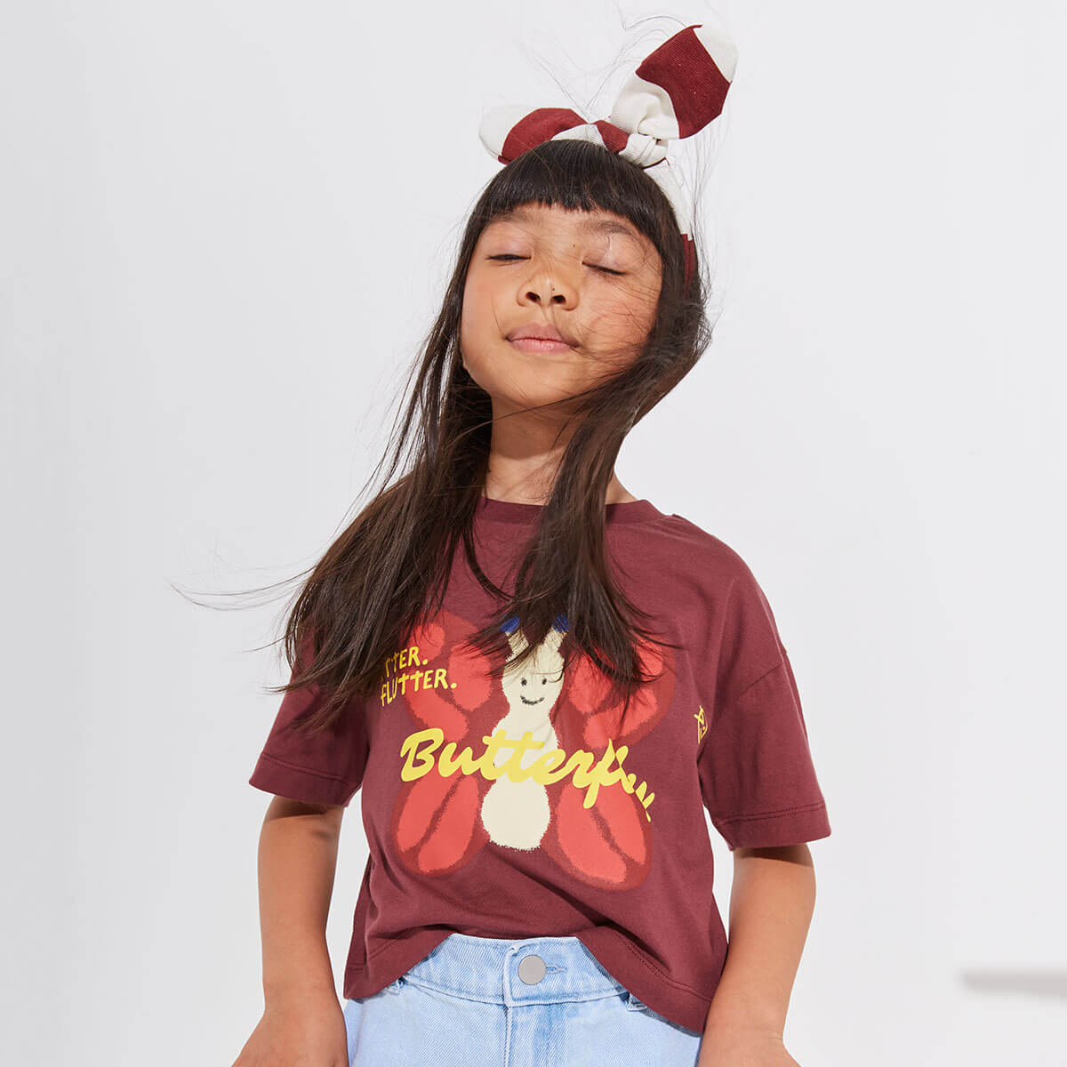 Cropped Bon Bon Tee by Wynken. Made from soft 100% organic cotton, this cropped t-shirt feels gentle on the skin and comfy for all day wear. The butterfly placement print stands out against the bench red base, playfully spelling out “Flitter Flutter Butterfly.” Finished with a sunny yellow Wynken logo, it adds a bright, cheerful signature touch.