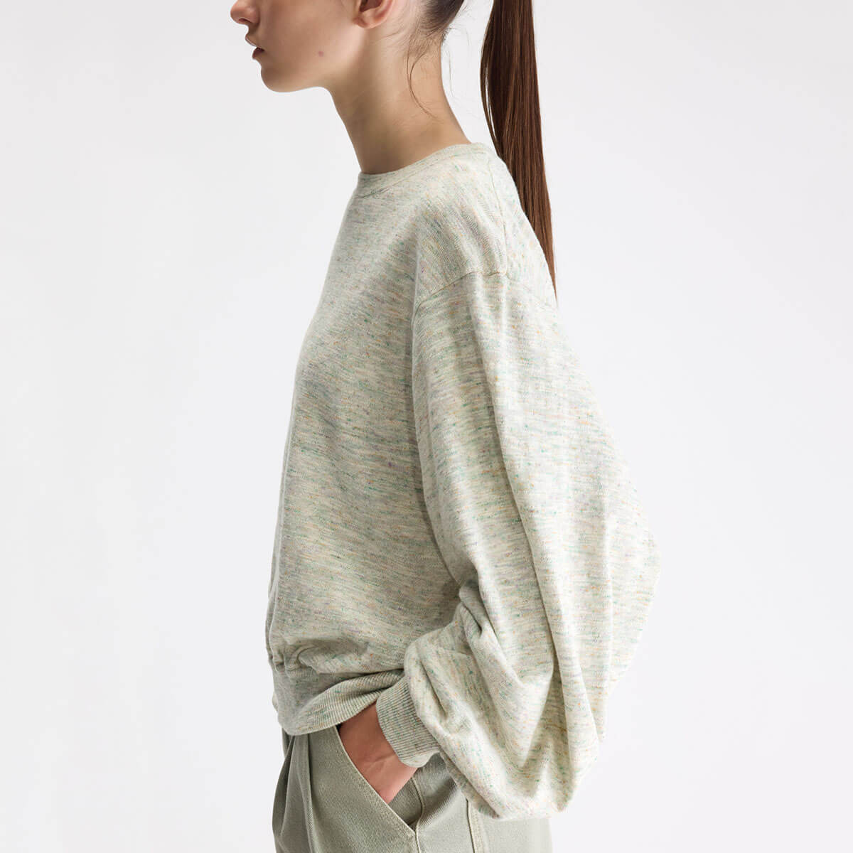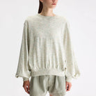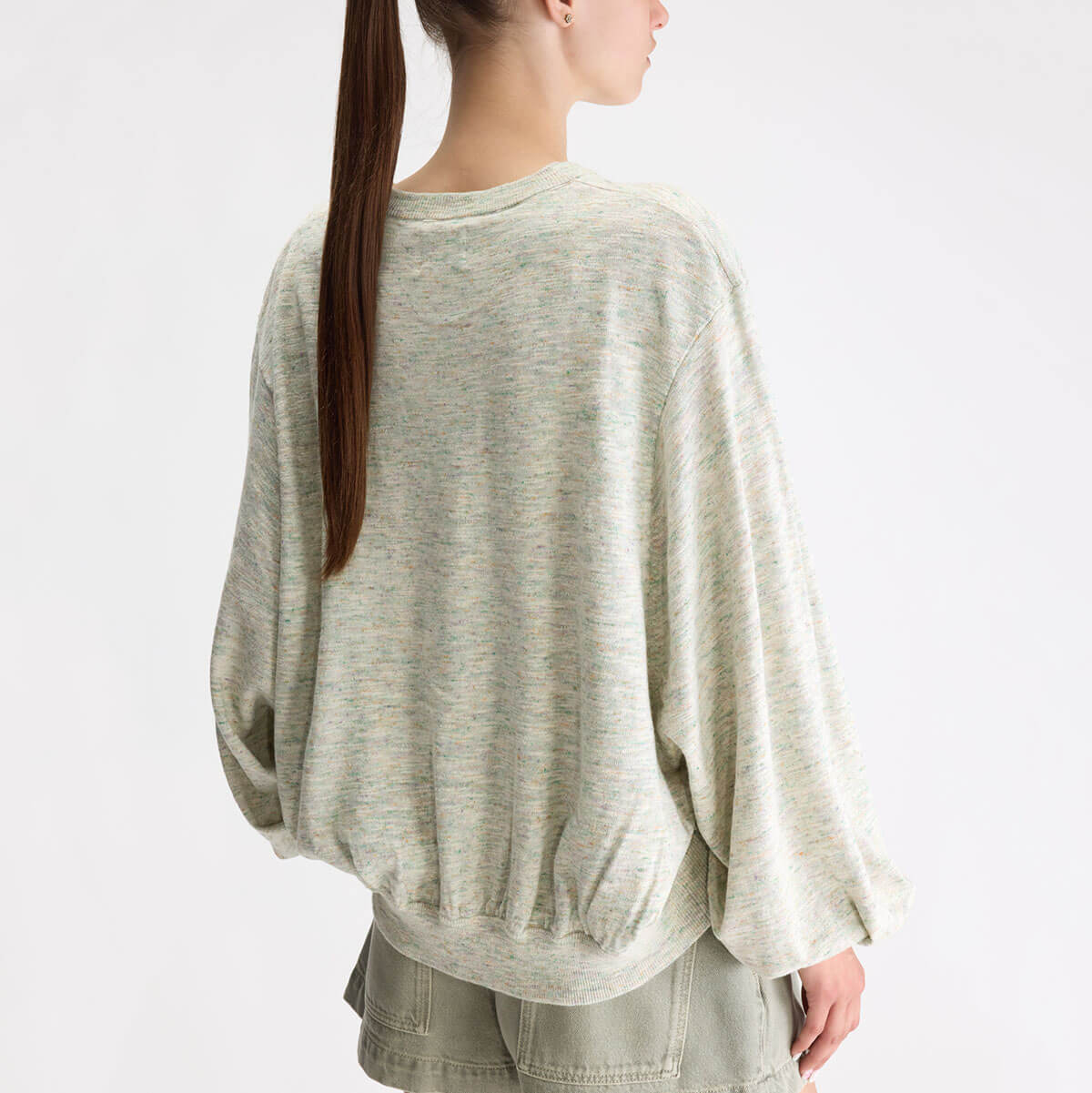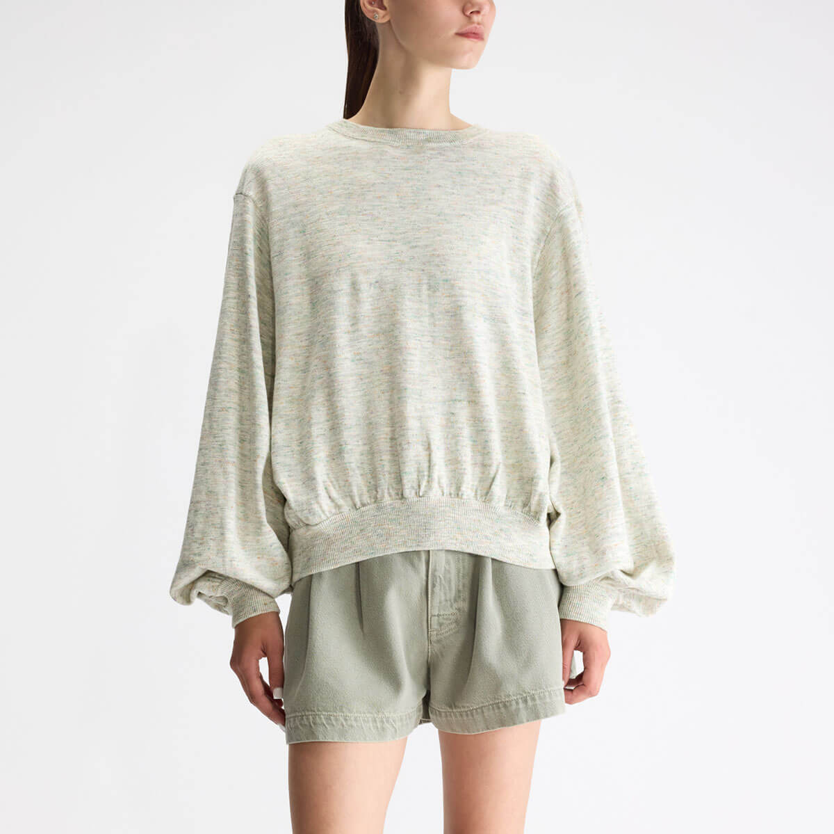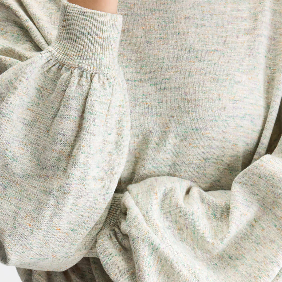 Domot Sweater by Bellerose. Oversized speckled crewneck jumper with balloon sleeves and gathering details on the cuffs.