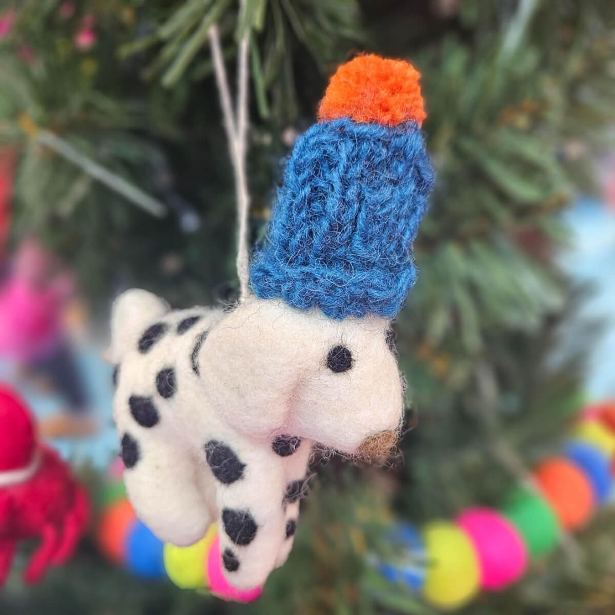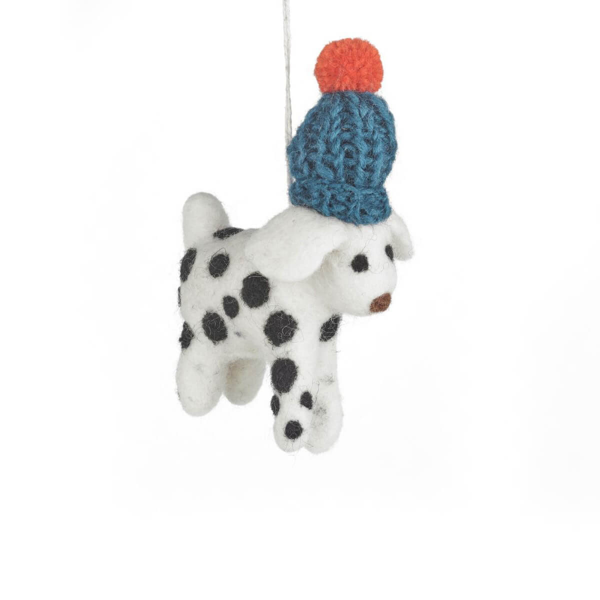 Dotty The Dog Hanging Decoration by Felt So Good. Dotty the Dog has also found herself the perfect winter accessory with her vibrant knitted bobble hat to compliment her fabulous spotty fur! Who says you have to sacrifice style for comfort? Handmade using traditional hand-felting techniques.