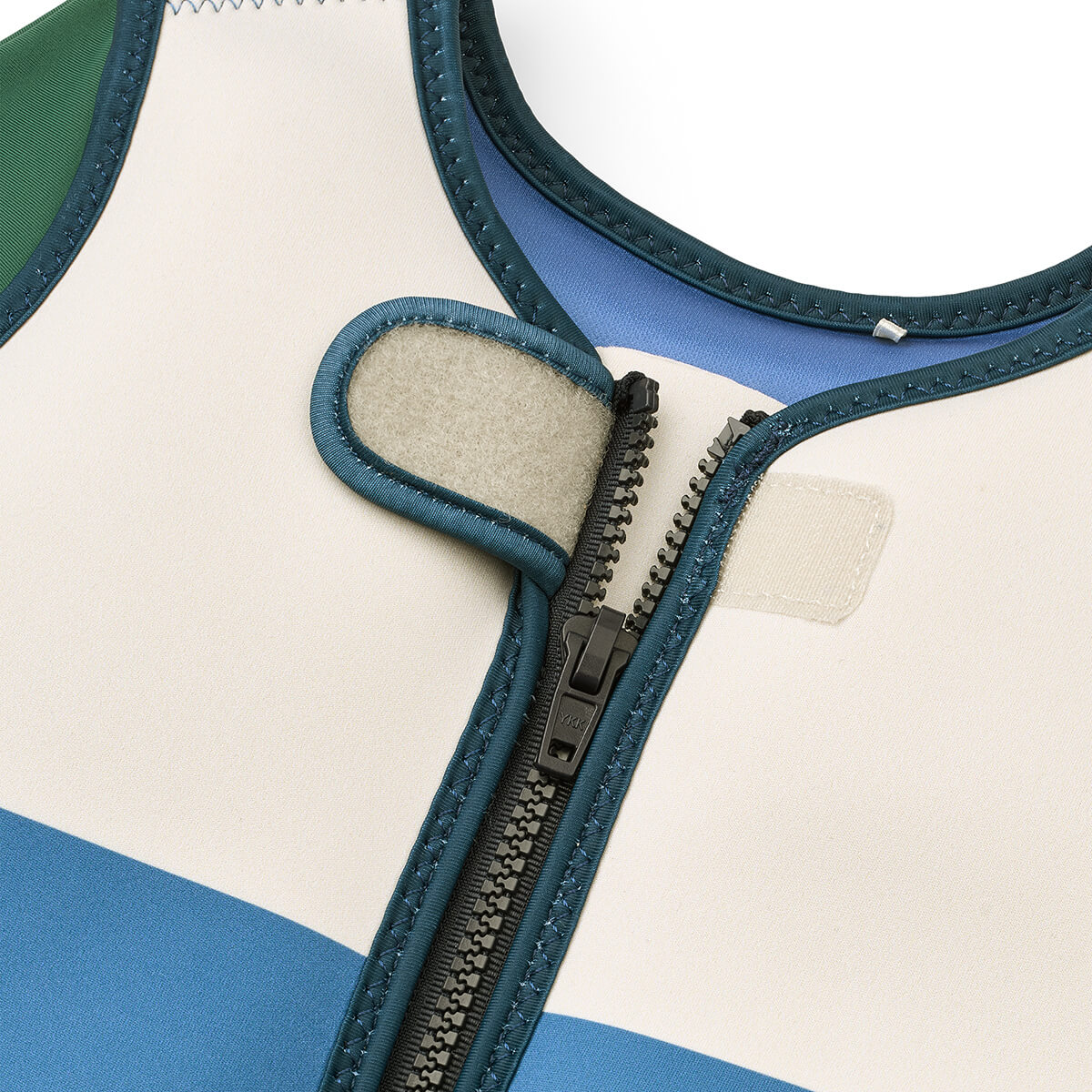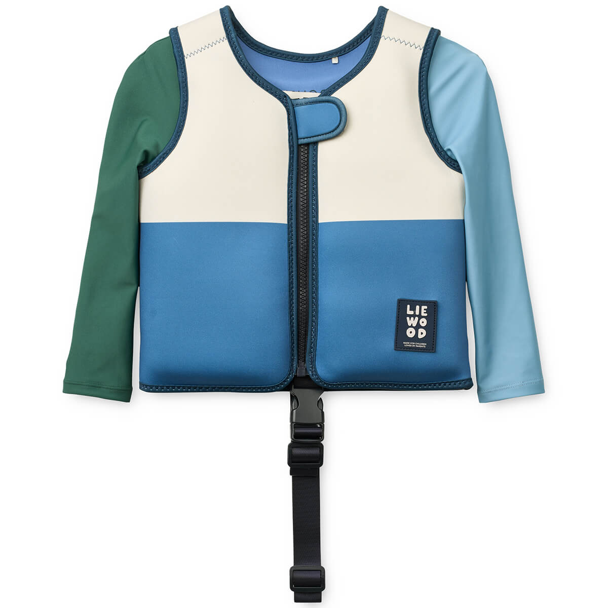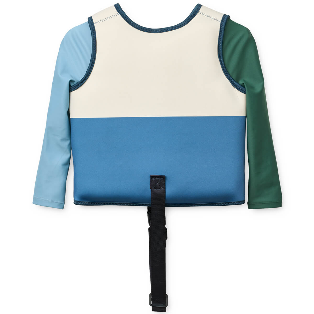 Dove swim vest with sleeves by Liewood. Swim vest with long sleeves and cool colour block design. The shell is made from 100% soft and quick-drying neoprene. Easy to take on and off with the front zipper and the strap between the legs allows for a secure and safe fit.
