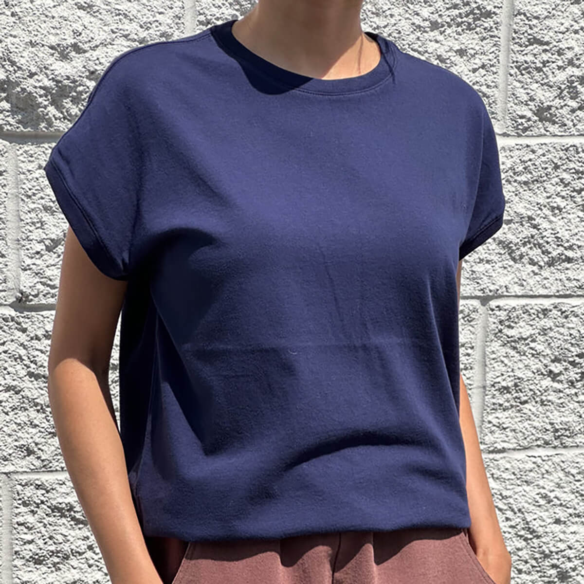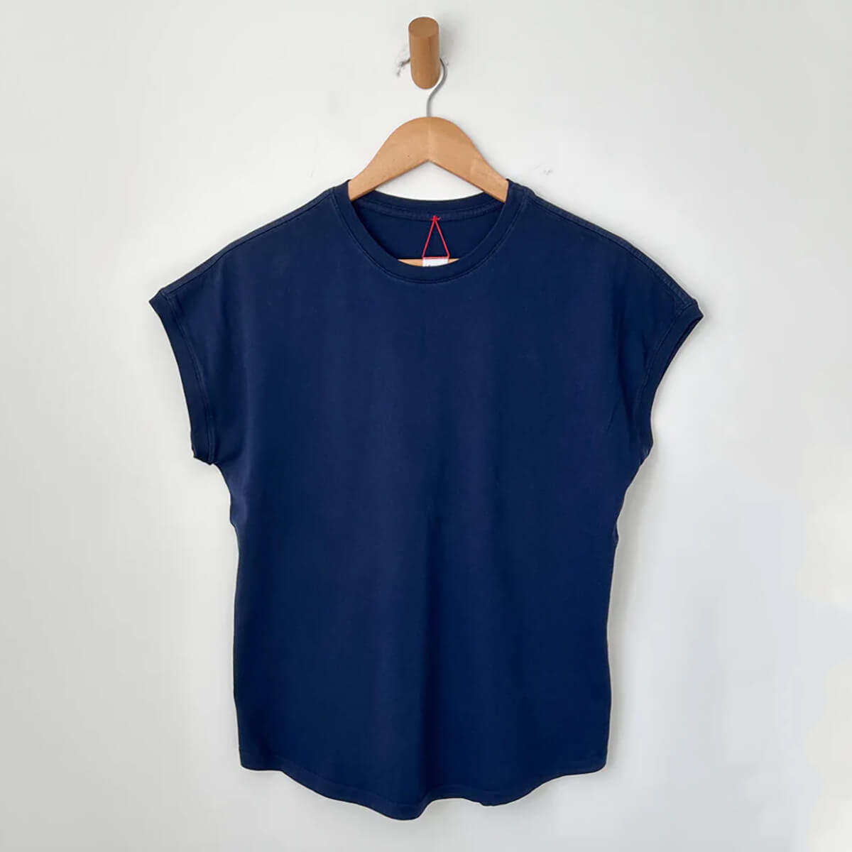 Ease Tee by Le Bon Shoppe. The Ease Tee is an edgy dolman tee. It features a high crew neck, shoulder coverage without a sleeve, slightly rounded hem and a contrast rib banded sleeve opening and neck opening. With a crisp colour palette and enough length to tuck in or out this is the perfect piece for a cool girl's uniform.