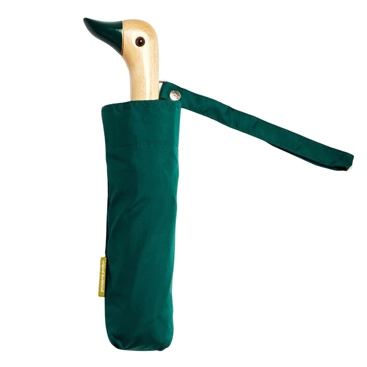 Forest Green Umbrella by Original Duckhead. This compact and lightweight umbrella in a classic forest green is wind resistant with an automatic open button, you can rely on the umbrella's sturdy build to keep you dry during any downpour. The canopy is made of 100% recycled plastic bottles. The umbrella fits into any backpack or tote bag, making it a convenient travel companion.