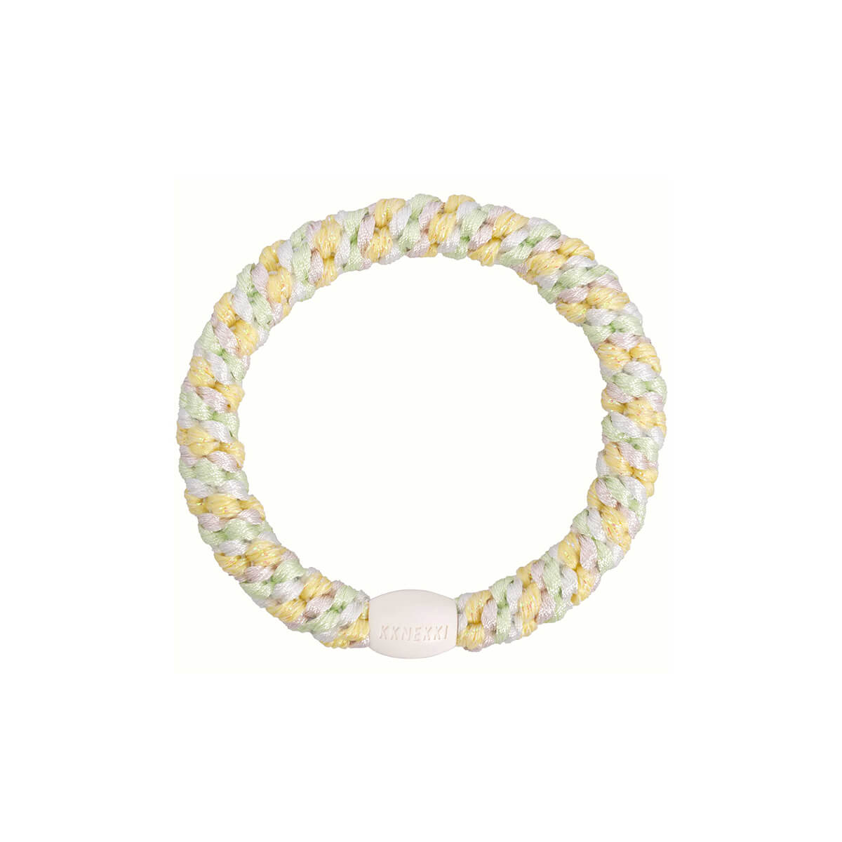 Kknekki snag free hair band by Bon Dep. The best hair ties ever made! The plastic bead and braiding ensures that it doesn't damage the hair. The hair band will also keep its shape when used.  And it also looks great worn as a bracelet too.