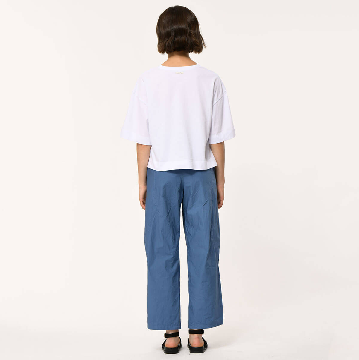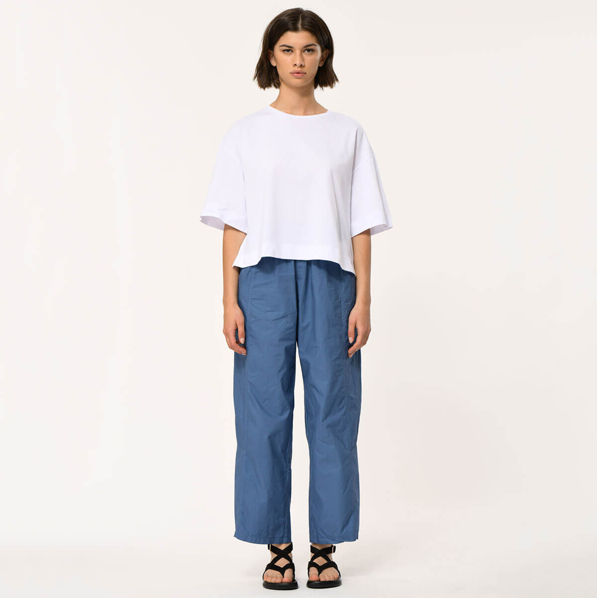 Komori Trousers by Humility. Cotton poplin 7/8ths trousers, with rounded cut with panel detailing, high elasticated waist and slanted side pockets.