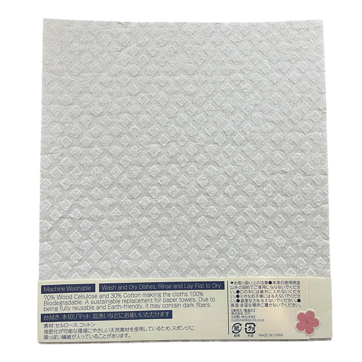 Reusable Natural Sponge Cloth by Zenco Japan. Sponge cloth made from 100% natural material from cellulose and cotton, both of which are extracted from wood scraps. It absorbs more than 10 times its own weight of water in no time, and when squeezed tightly, the water is quickly released and evaporates from the countless pores on the surface. This means bacteria are not likely to multiply, and the source of unpleasant smells is not created.