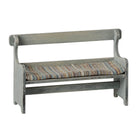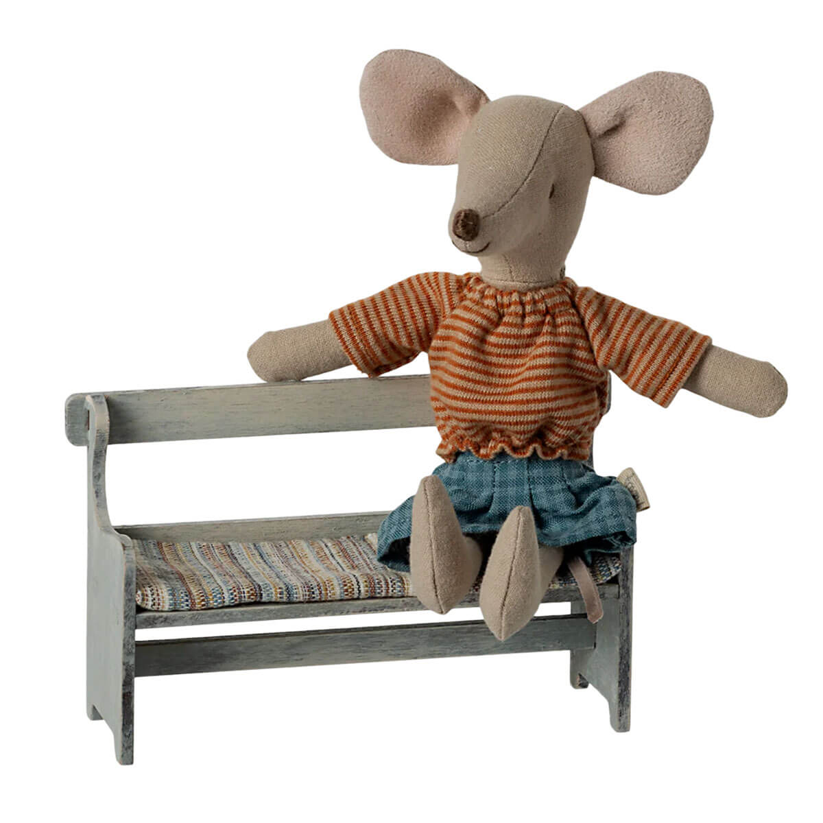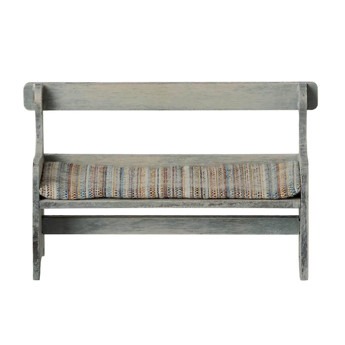 Mouse wooden bench by Maileg. A wooden bench made to fit the mouse family perfectly. It has a beautiful hand painted vintage look - variations may occur - and a soft cushion on top of the bench for a comfortable seat.