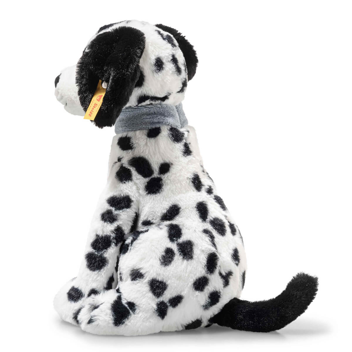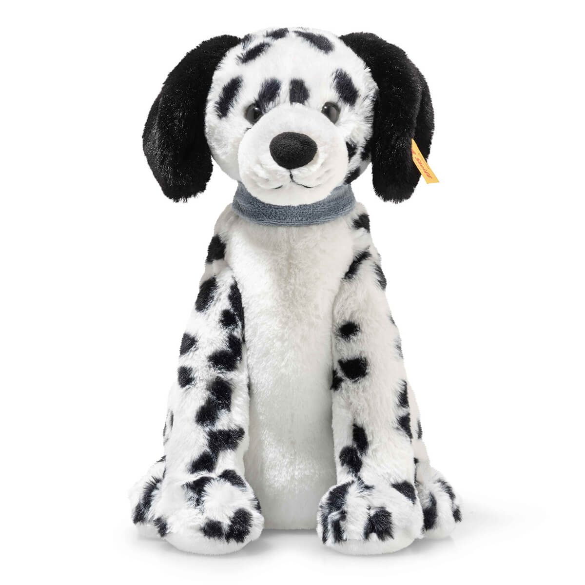 Oskar Dalmation by Steiff. Full marks for this dog: The sitting Dalmatian Oskar is 27 cm tall and made of cuddly plush. With the typical black dots on bright white, this spotty friend is a true stand out. The blue Softboa collar provides a pretty contrast to the black and white fur, and its friendly look invites you to play and cuddle. The weight bags filled with granules in the legs, feet and body ensure that the faithful four-legged friend is particularly stable. This makes him the ideal guard for the children’s room and a lovable family dog.