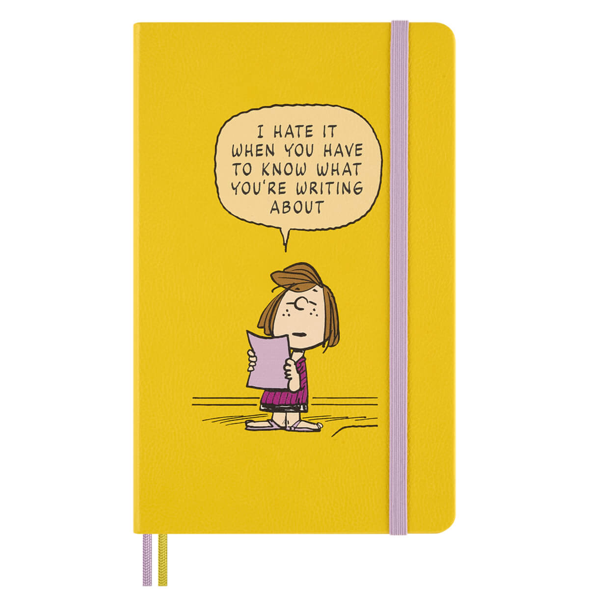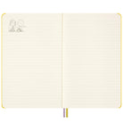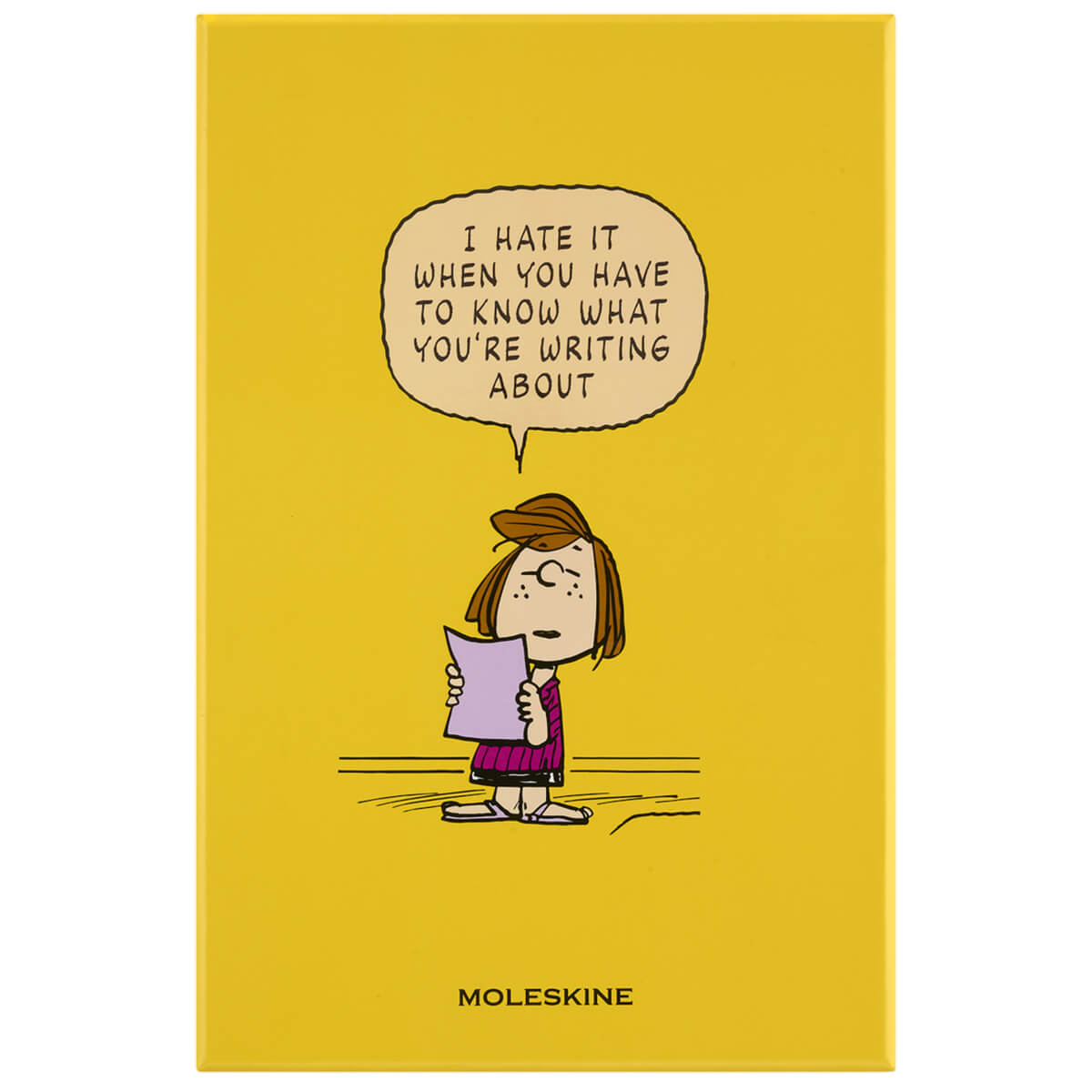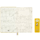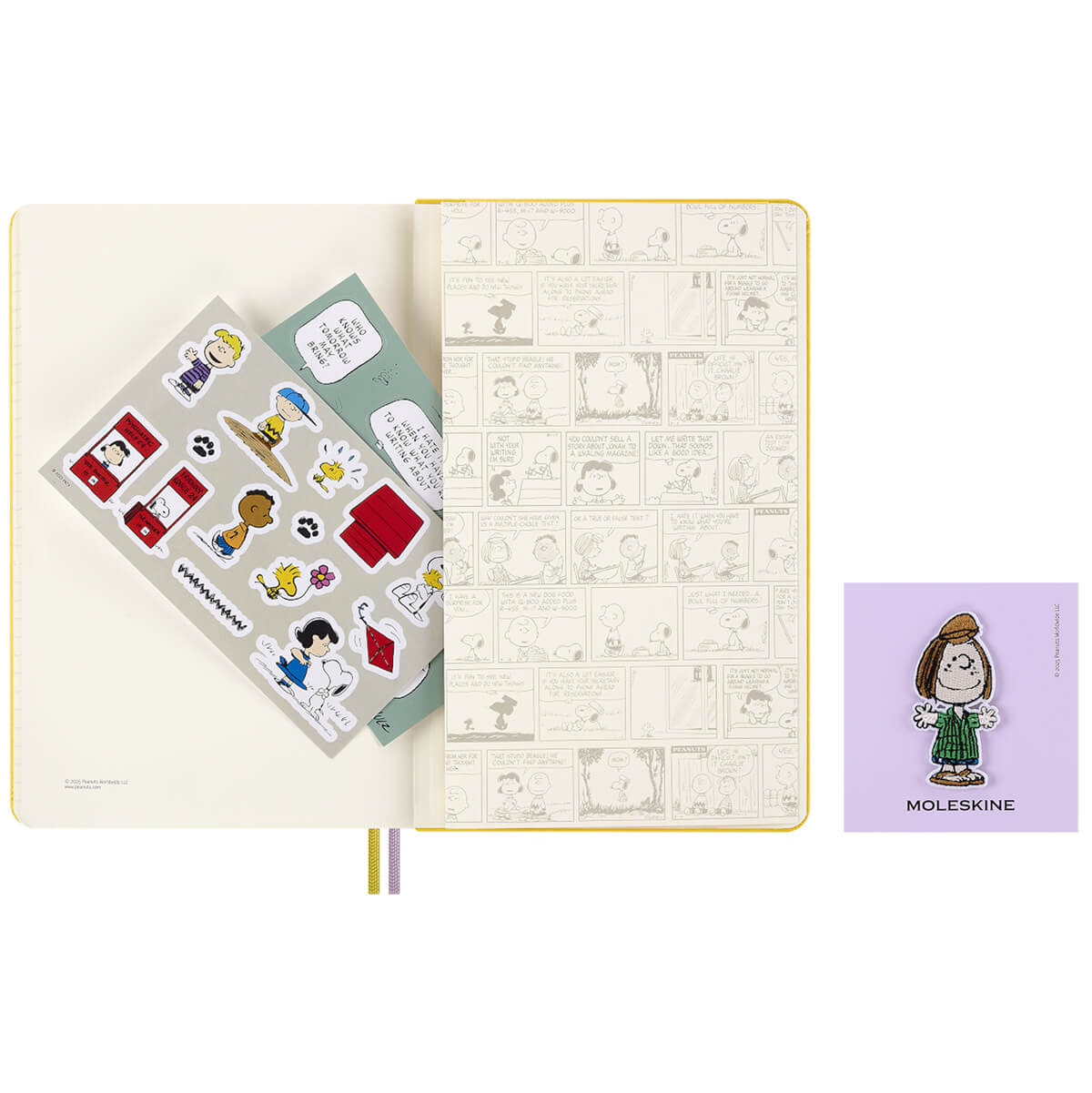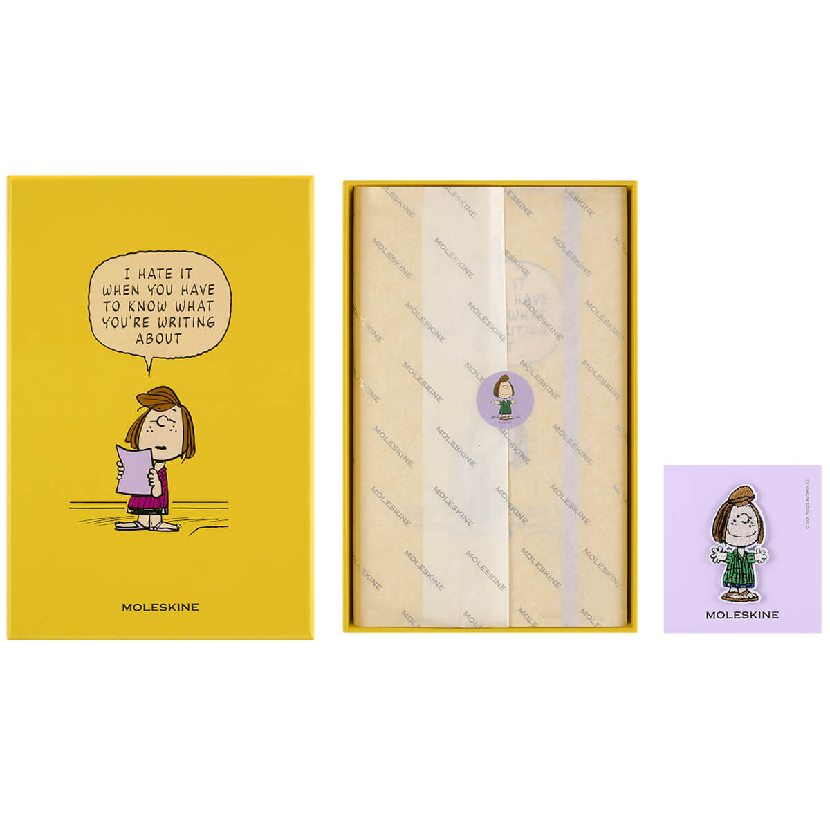 Peanuts Limited Edition Gift Box with Patty Notebook and Patch by Moleskine. A special gift box set containing a limited edition Peanuts notebook, a reusable stick-on patch, themed stickers and bookmark.  The set includes a large ruled Moleskine notebook with a vibrant yellow hardcover with an expandable inner pocket, a cute Patty reusable stick-on embroidered patch, Peanuts themed stickers and matching yellow Patty bookmark.