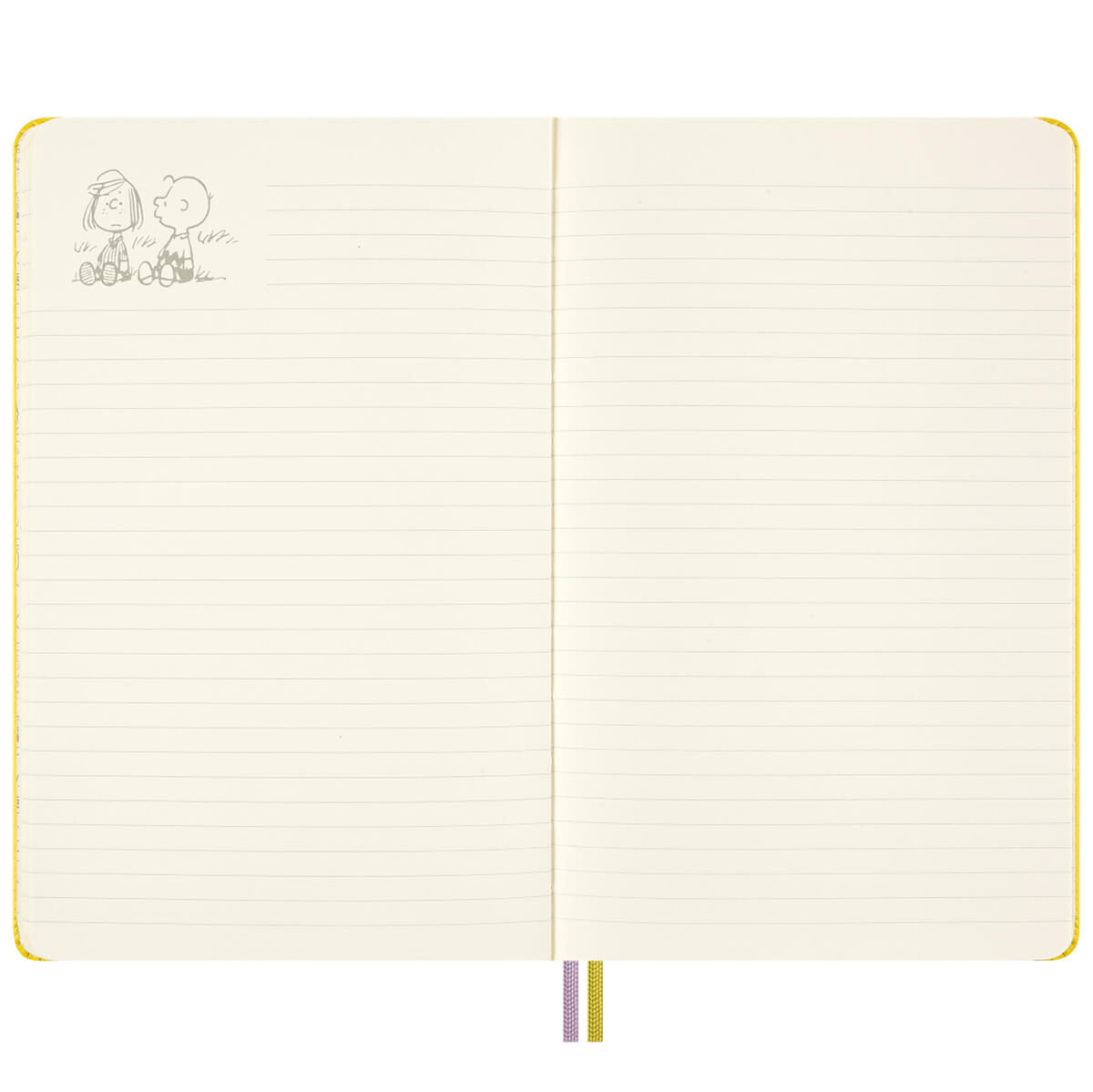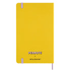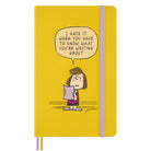 Peanuts Limited Edition Patty Notebook by Moleskine. Large ruled Moleskine notebook with a vibrant yellow hardcover and a contrast pink notebook elastic closure. Includes an expandable inner pocket and Peanuts themed stickers and matching yellow Patty bookmark.