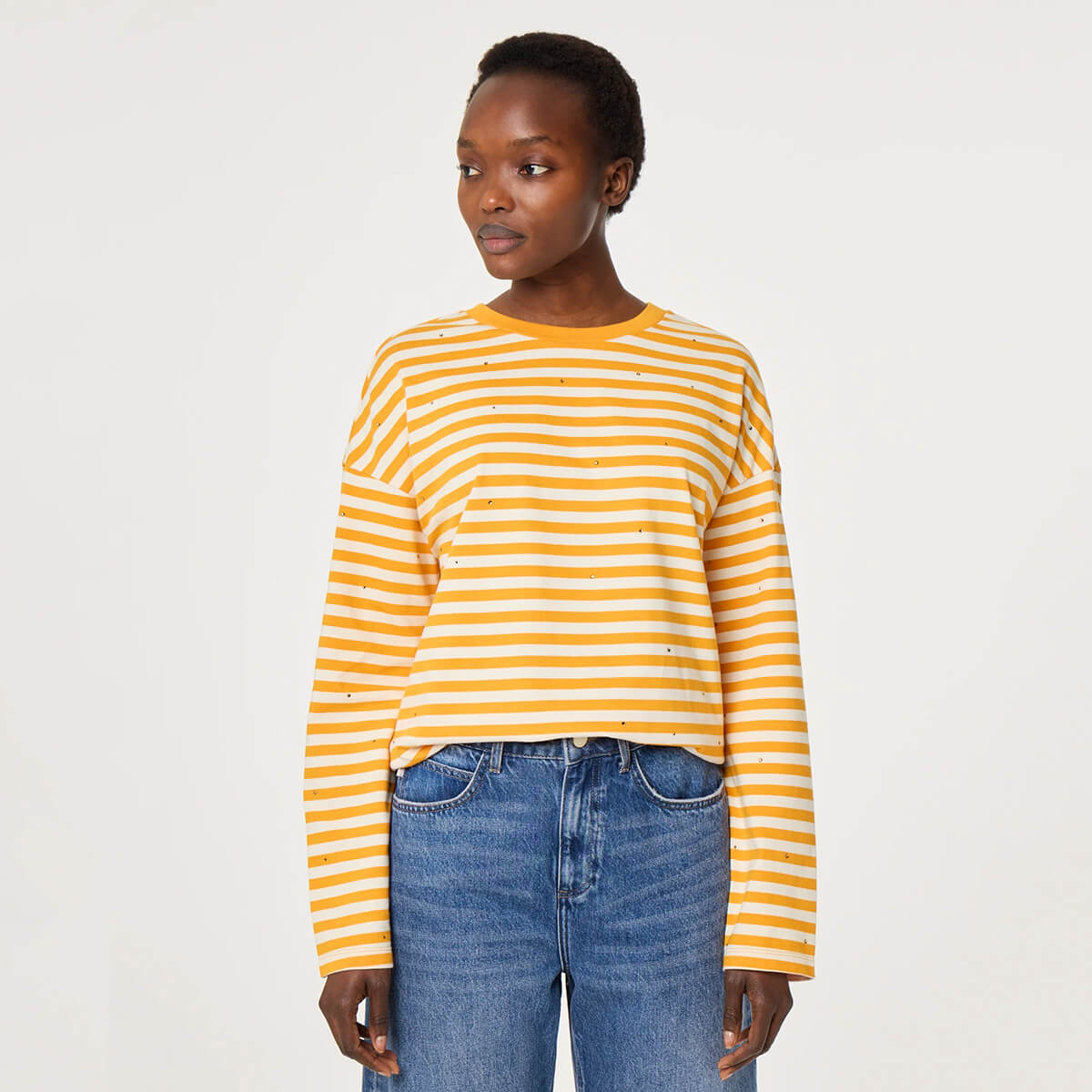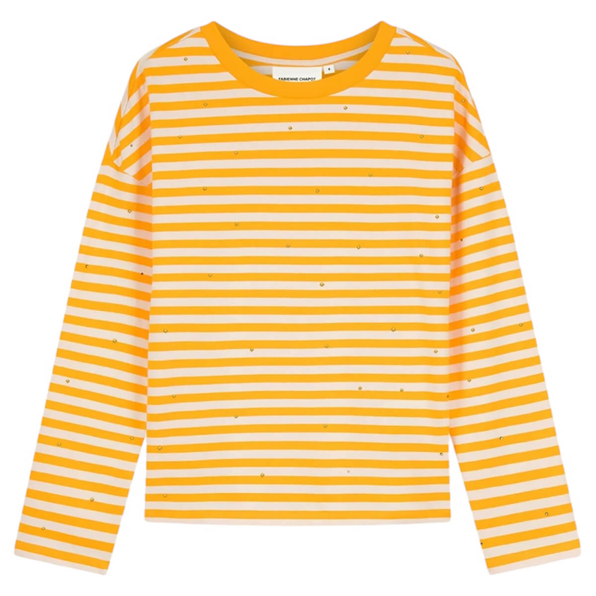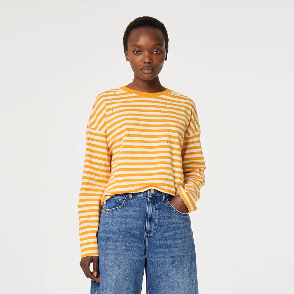 Phileine Long Sleeve T Shirt by Fabienne Chapot. This loose-fit T-shirt, crafted from 100% organic cotton, features cheerful orange stripes for a fun twist on a classic basic. Lightweight and breathable, it’s perfect for everyday wear, pairing effortlessly with skirts, jeans, or relaxed trousers.