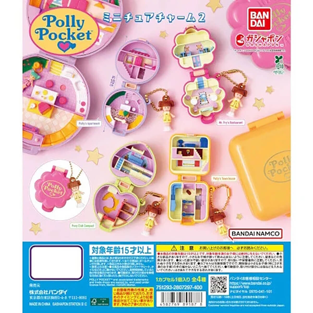 There are four Polly Pockets in this Gachapon series: Polly's Apartment, Mr Frys Restaurant, Pony Club Compact and Polly's Town House.