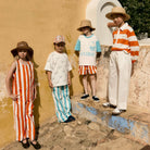 Stripes Twill Jeans by Tinycottons. These classic cut long pants in soft light twill fabric combine elegance and comfort in a versatile design. They feature a waistband with belt loops and a snap button closure, front internal pockets, and back pockets, offering functionality without compromising style. Perfect for casual looks or slightly dressier occasions.