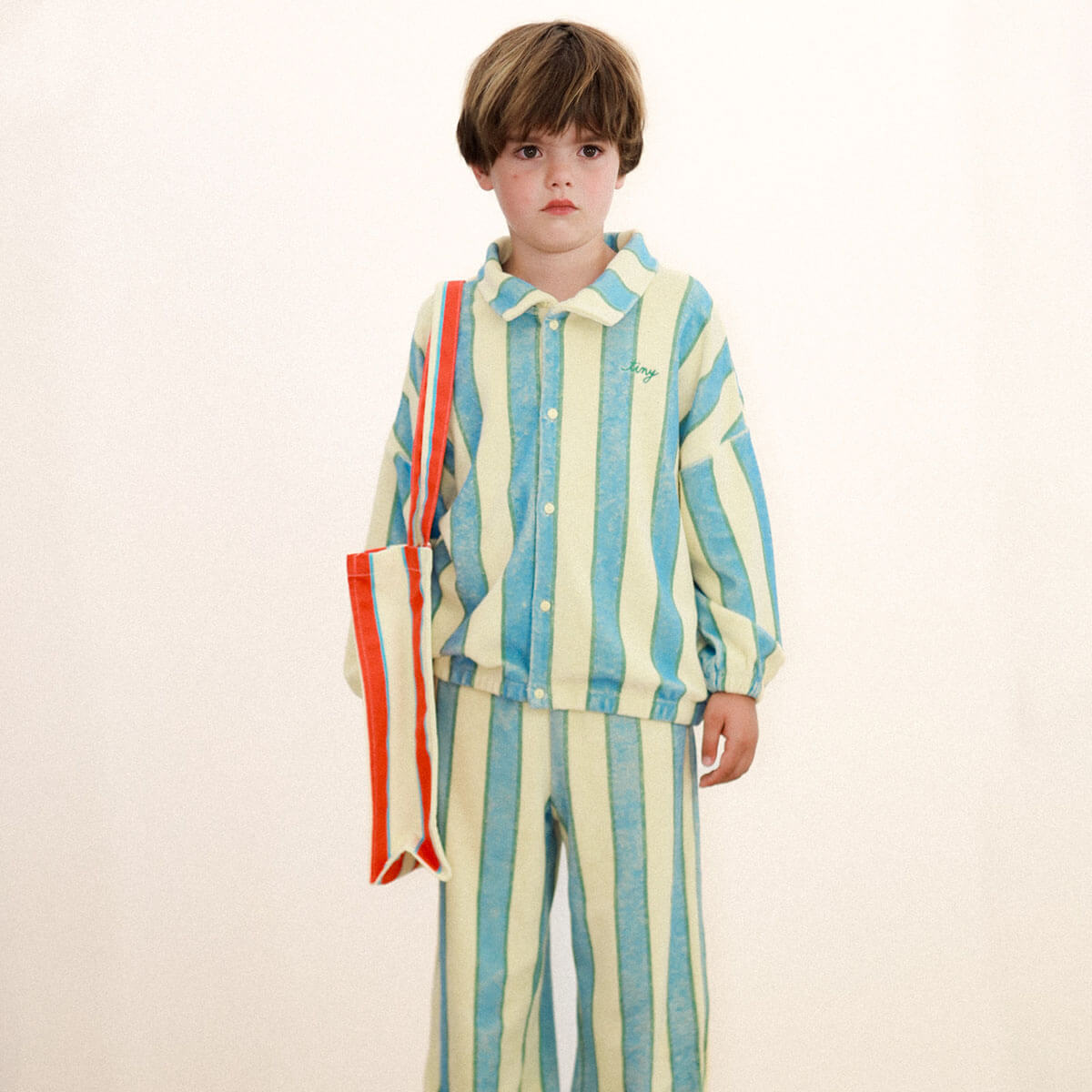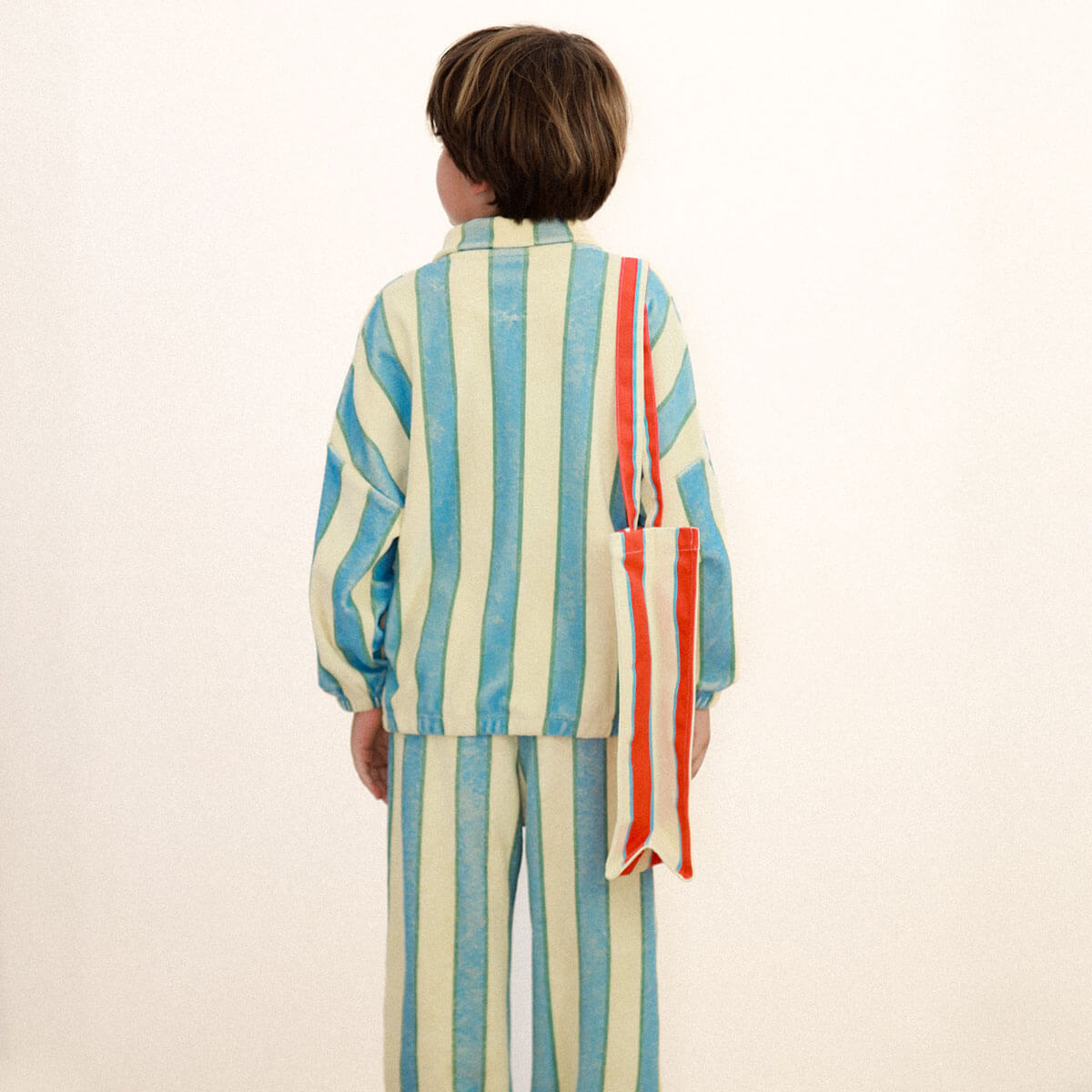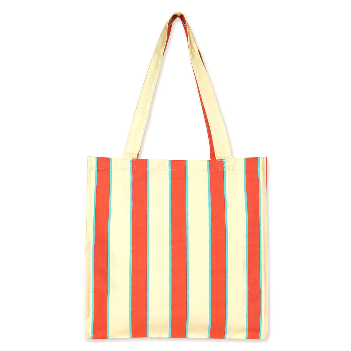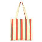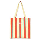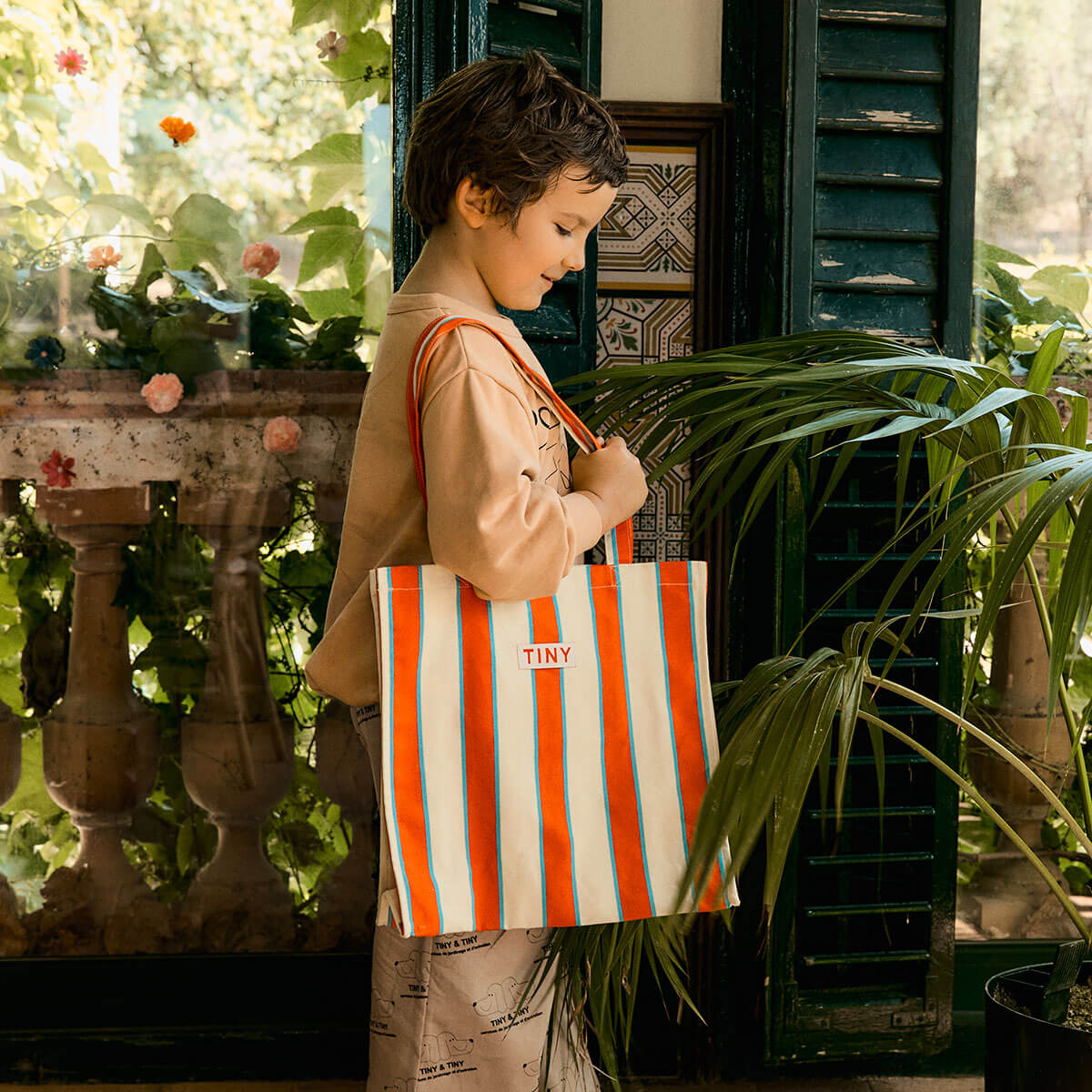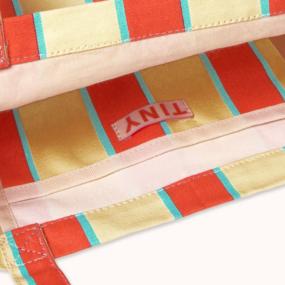 Tiny Tote Bag by Tinycottons. Crafted from sturdy fabric featuring the retro stripes print on a pastel yellow base, this tote bag includes large handles for comfortable carrying by hand or over the shoulder. It offers ample interior space to hold all your daily essentials. The TINY logo is placed at the top of the bag, adding a distinctive touch.