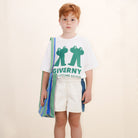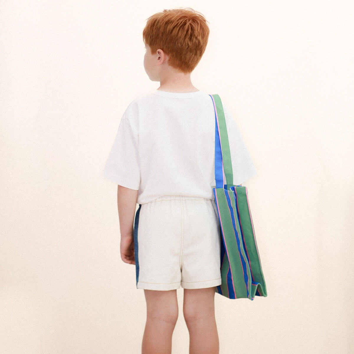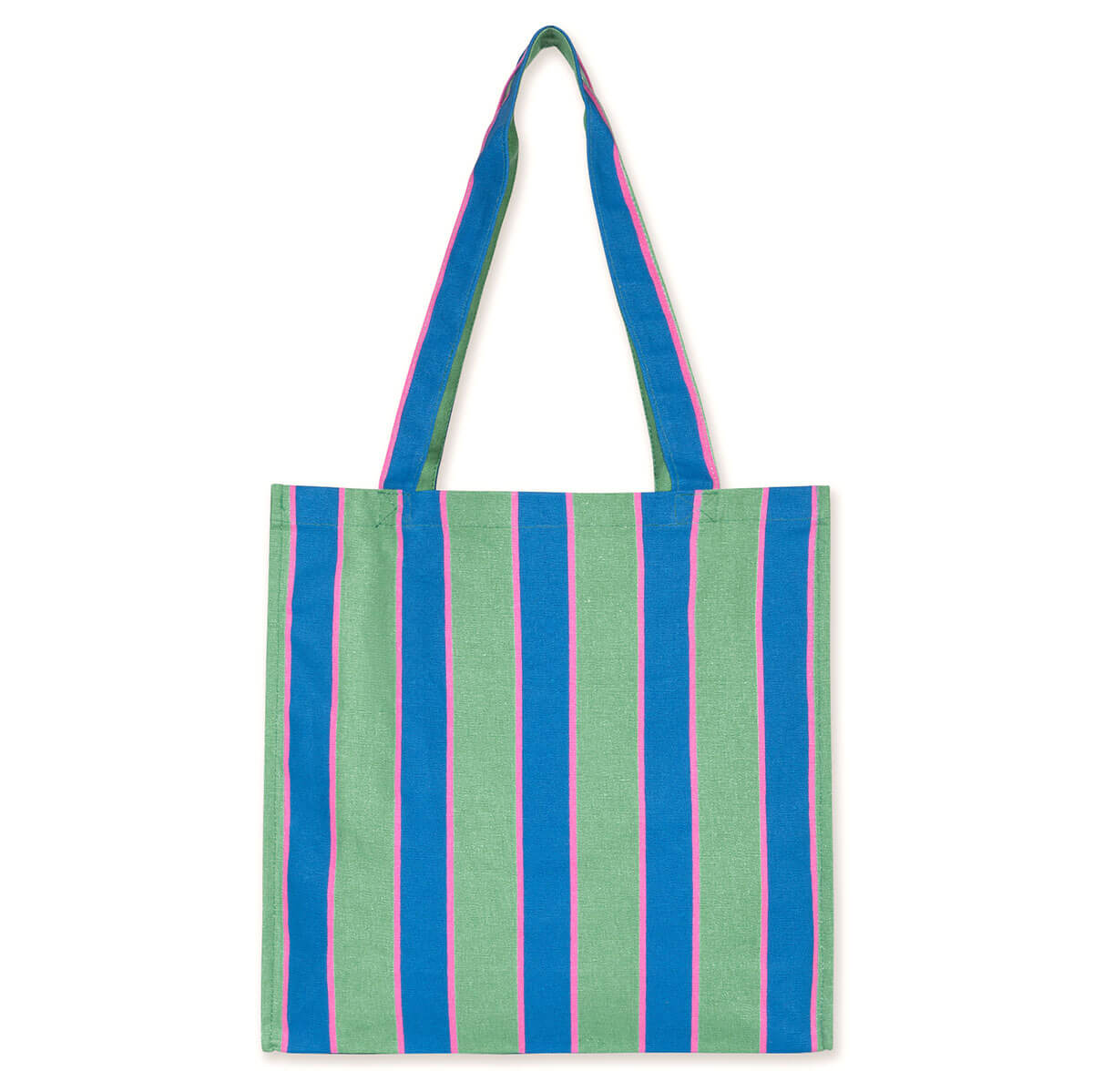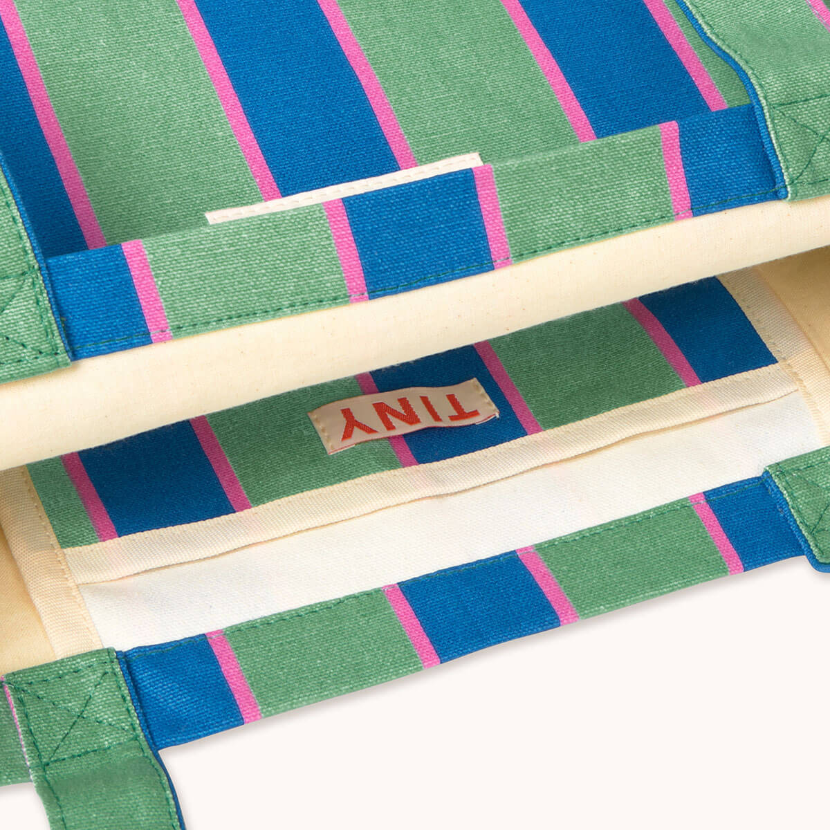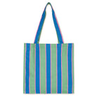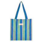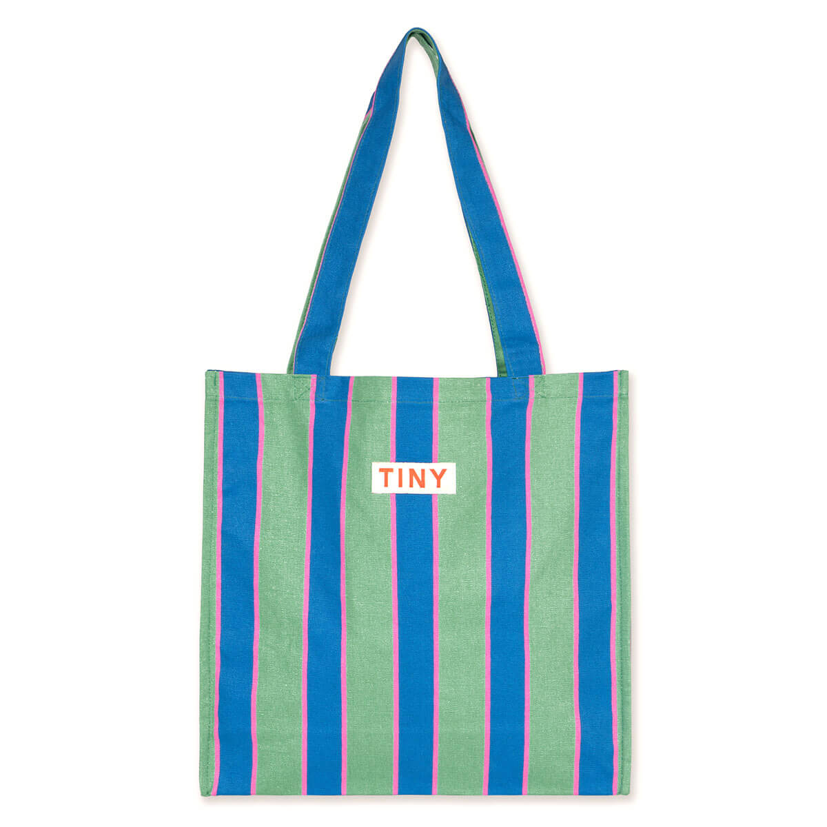 Tiny Tote Bag by Tinycottons. Crafted from sturdy fabric featuring the retro stripes print on an emerald base, this tote bag includes large handles for comfortable carrying by hand or over the shoulder. It offers ample interior space to hold all your daily essentials. The TINY logo is placed at the top of the bag, adding a distinctive touch.
