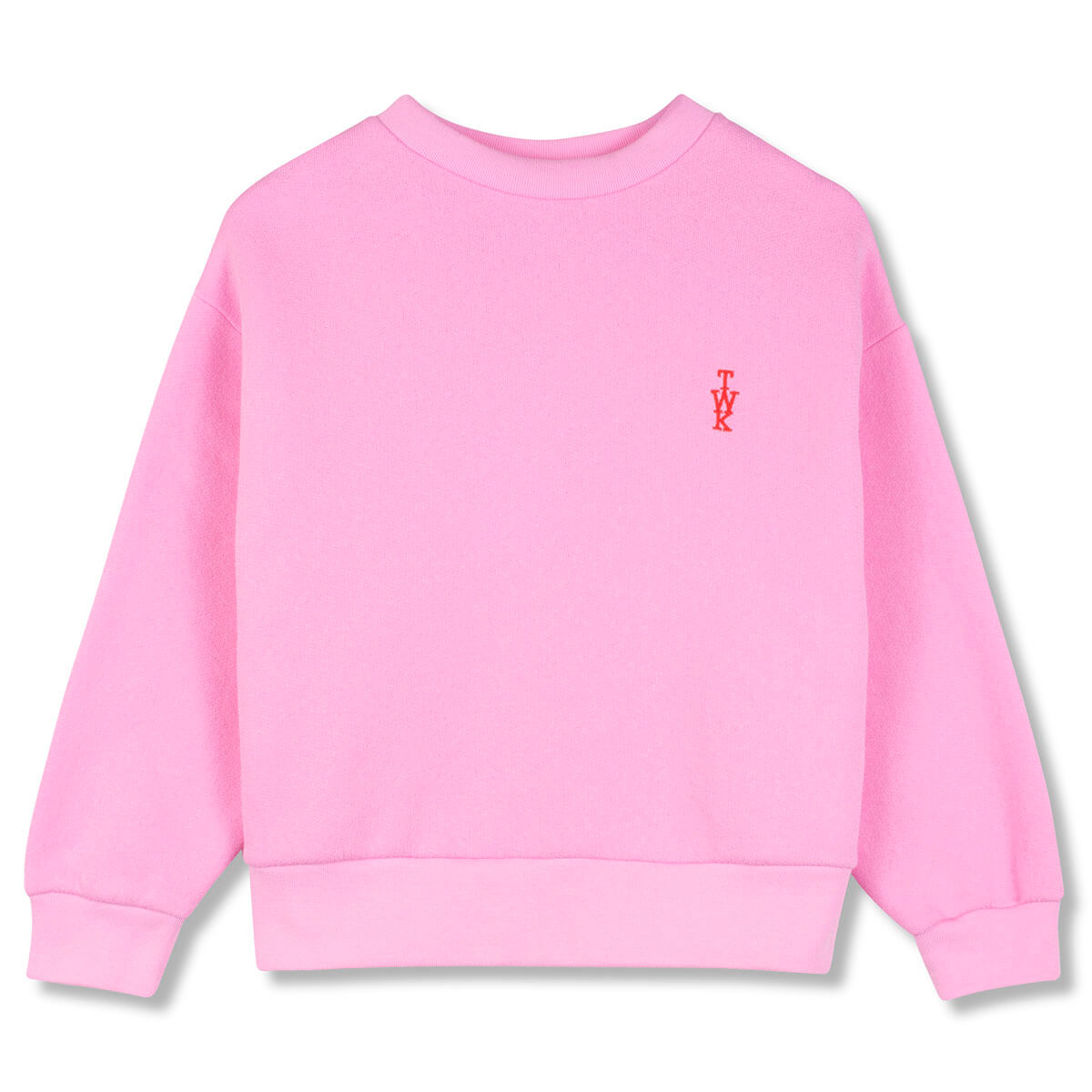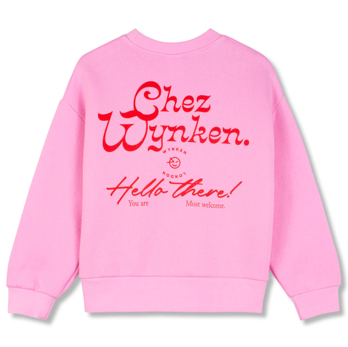 Twk Sweat by Wynken. This feel good sweatshirt is understated at the front and full of fun at the back. The candy pink base features subtle red TWK embroidery, while bold Chez Wynken artwork across the back adds a playful burst of character. Dropped shoulders and ribbed trims create a relaxed, easy-to-wear fit. Made from a brushed poly-cotton blend that’s slightly heavier than standard jersey, it feels soft and cosy against the skin, ideal for early season days or cooler evenings.
