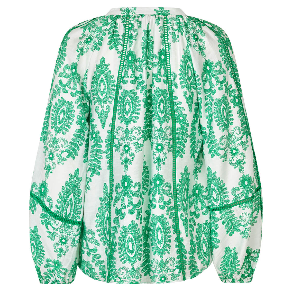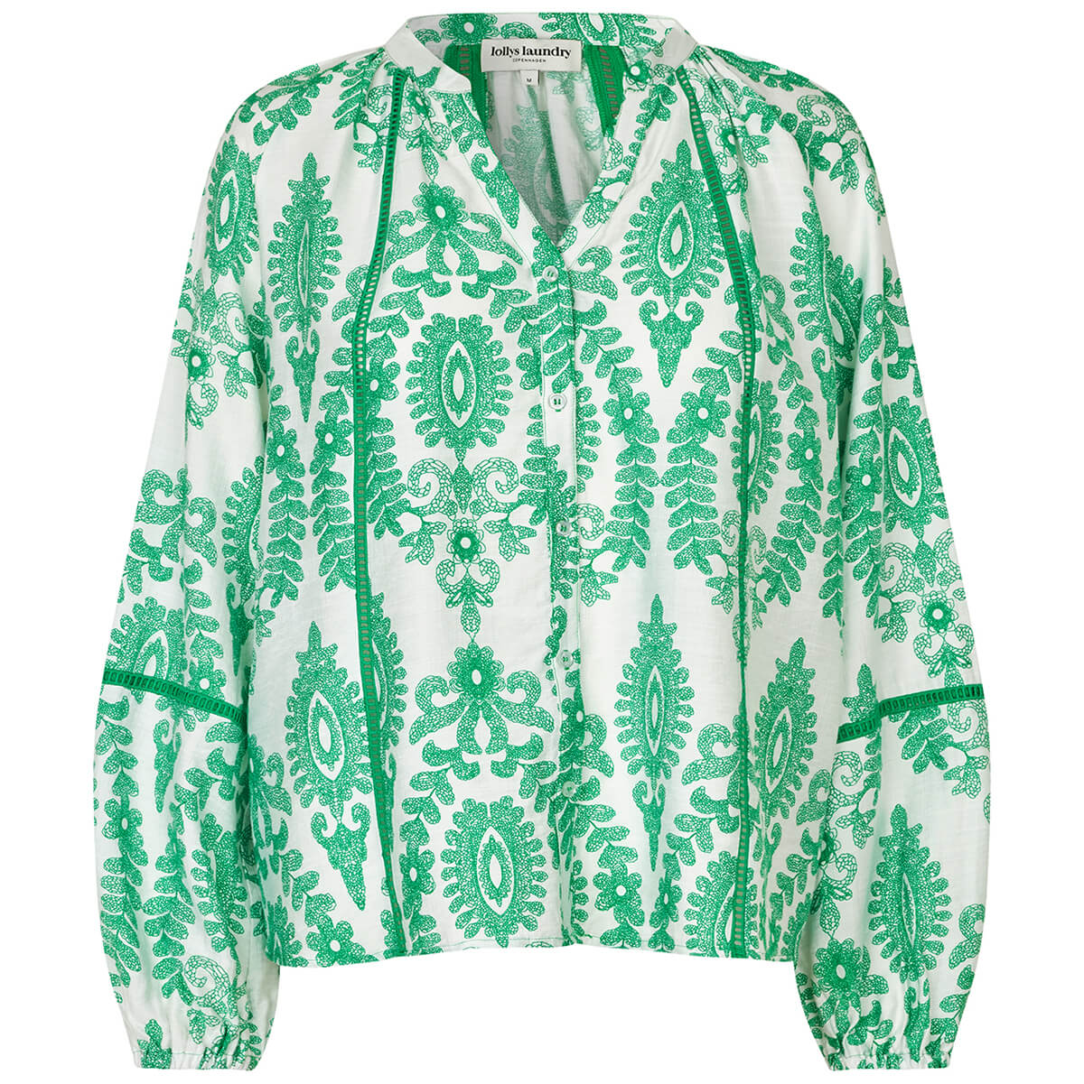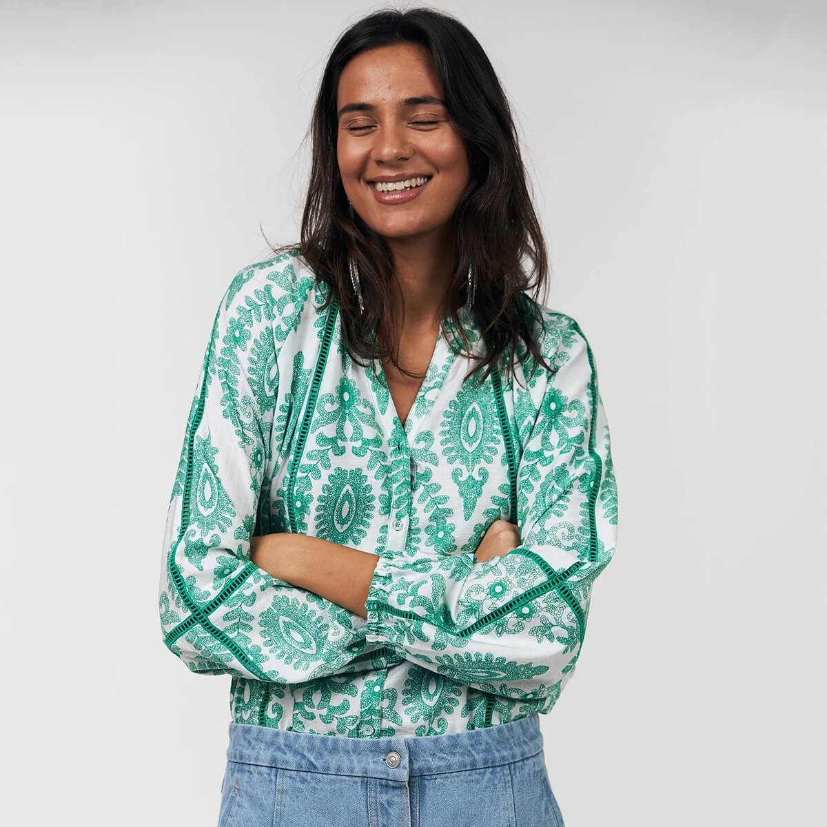 Vero Shirt by Lollys Laundry. A light and feminine shirt filled with beautiful details. It is made in a soft quality that drapes effortlessly and features a decorative all over print in bright colours.