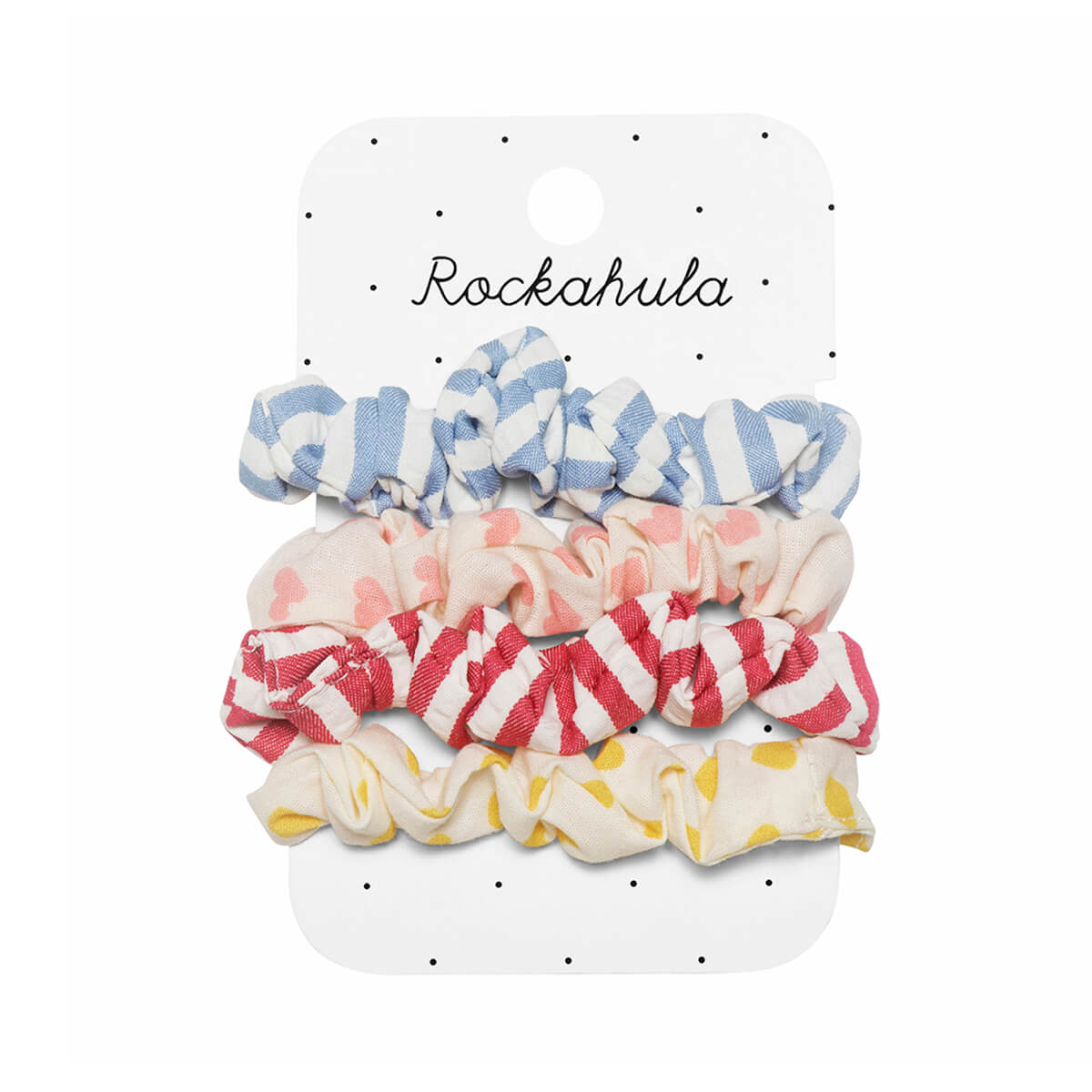 Vintage Seaside scrunchie set by Rockahula Kids. A pack of four sweet seaside scrunchies, each in a different beautiful fabric. Featuring two deckchair-inspired striped blue and red, and two with a neutral base with pink or yellow love hearts.