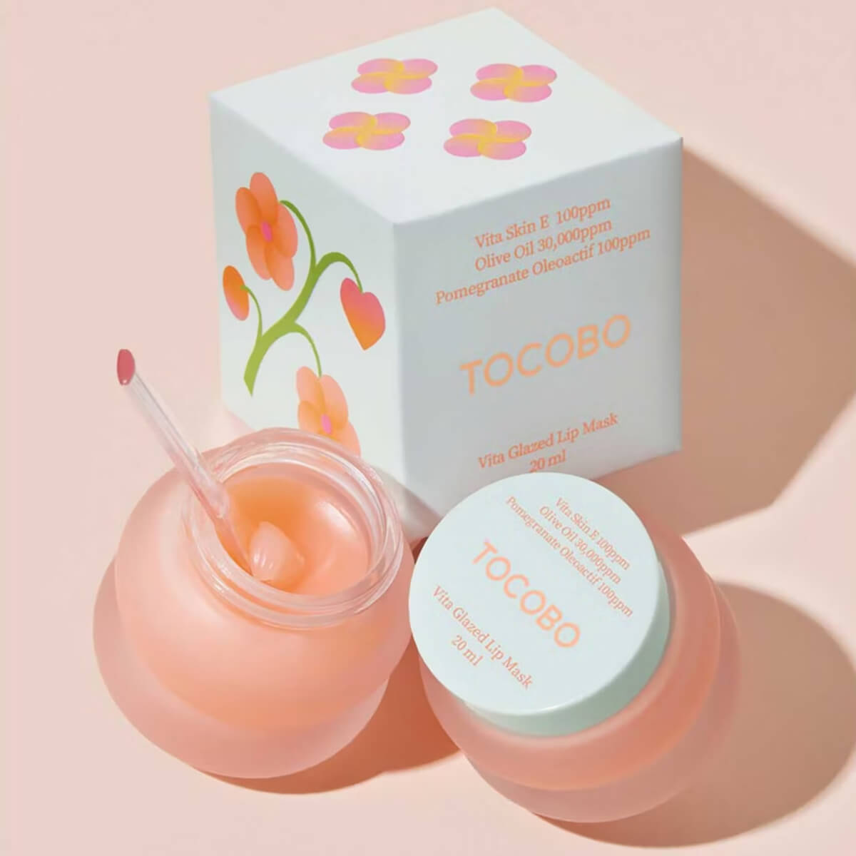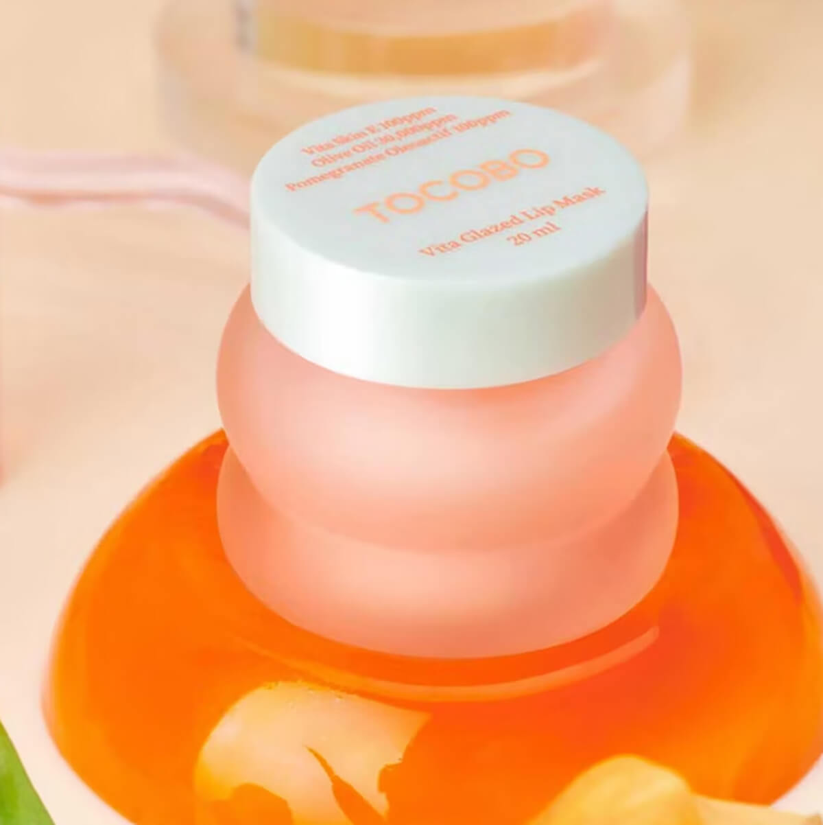 Vita Glaze Lip Mask by Tocobo. A day and night plumping lip mask that melts away dead skin cells while you sleep, leaving lips soft and supple by morning. Enriched with Vitamin E, Olive Oil, and Pomegranate Flower Extract to strengthen the lip barrier.