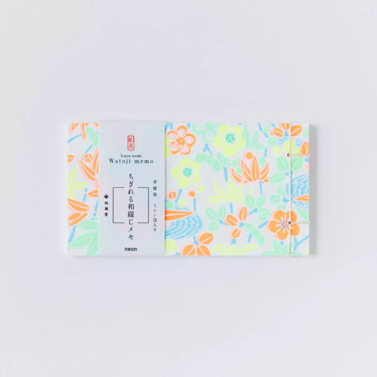 Watoji Memo Pad Neon 6 by Shogado. The Watoji Memo Pad by Shogado is handcrafted in Kyoto using traditional techniques. Featuring a hand-stitched binding and a beautiful Yuzen washi paper cover, the memo pad contains high-quality paper, perfect for writing notes with a pen. Each page is perforated and tears off easily, combining functionality with timeless Japanese craftsmanship.