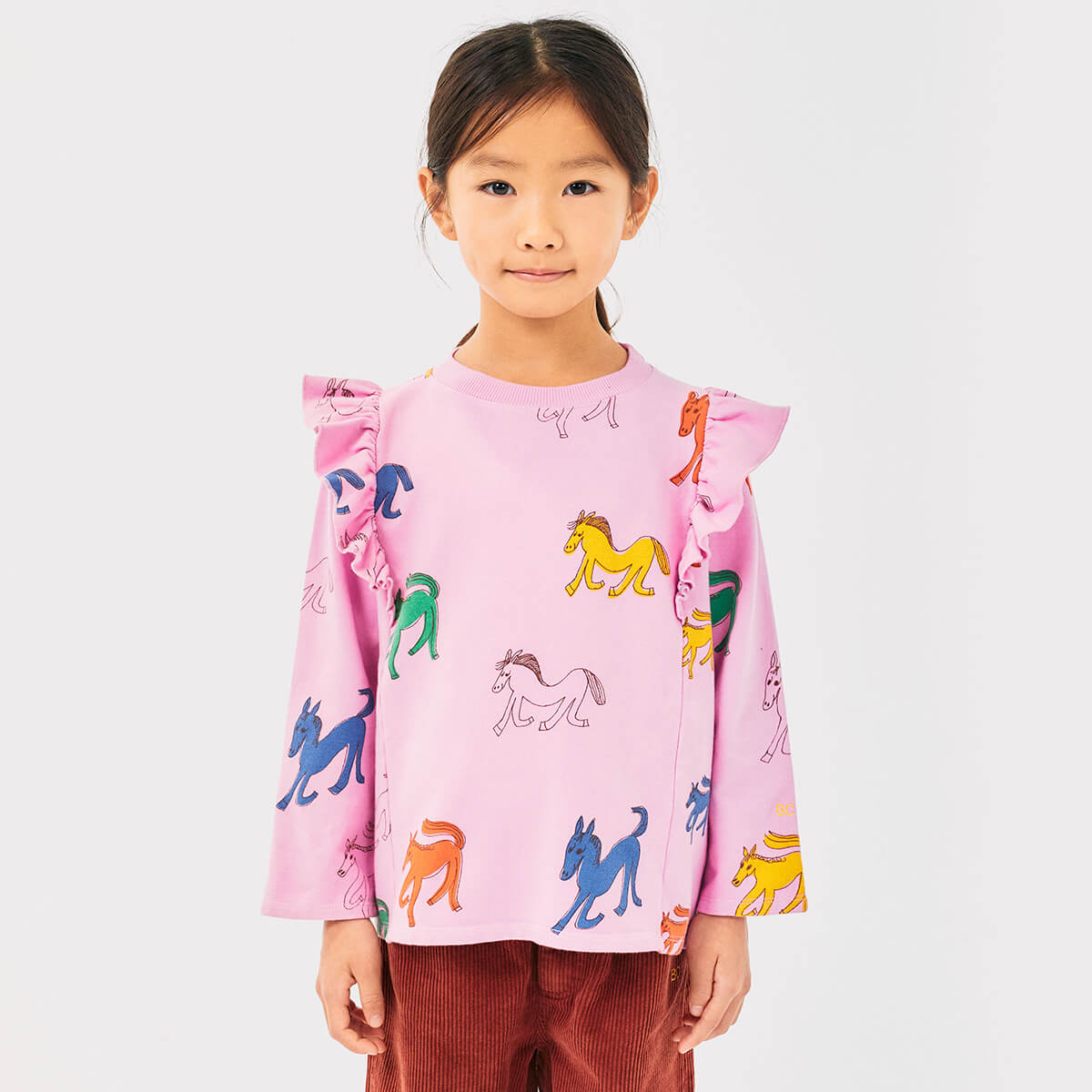 Wonder Horse All Over Ruffle Sweatshirt by Bobo Choses. This playful sweatshirt brings comfort to everyday adventures. Designed with long sleeves, ribbed cuffs, a round neck, ruffled shoulders and loose fit for a relaxed, comfortable look. Features a fun wonder horse all over print.