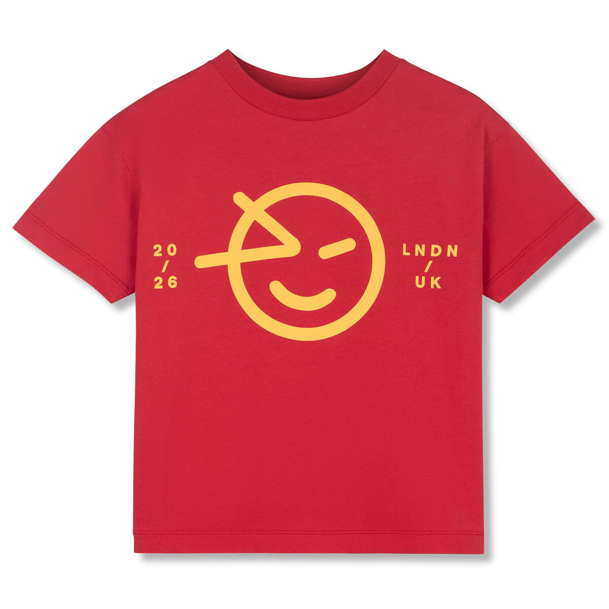 Wynken Tee by Wynken. Soft, breathable 100% organic cotton makes this pillar red t-shirt gentle on the skin and comfortable all day long. The sunny yellow Wynken logo and micro text pop against the bold base, adding a playful, signature touch.