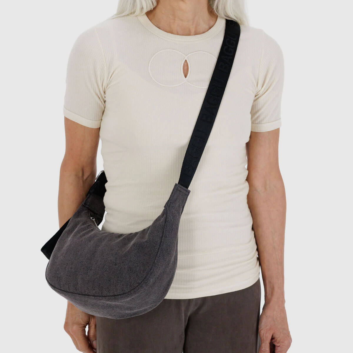 Small Denim Crescent Bag in Washed Black by Baggu